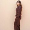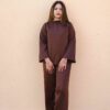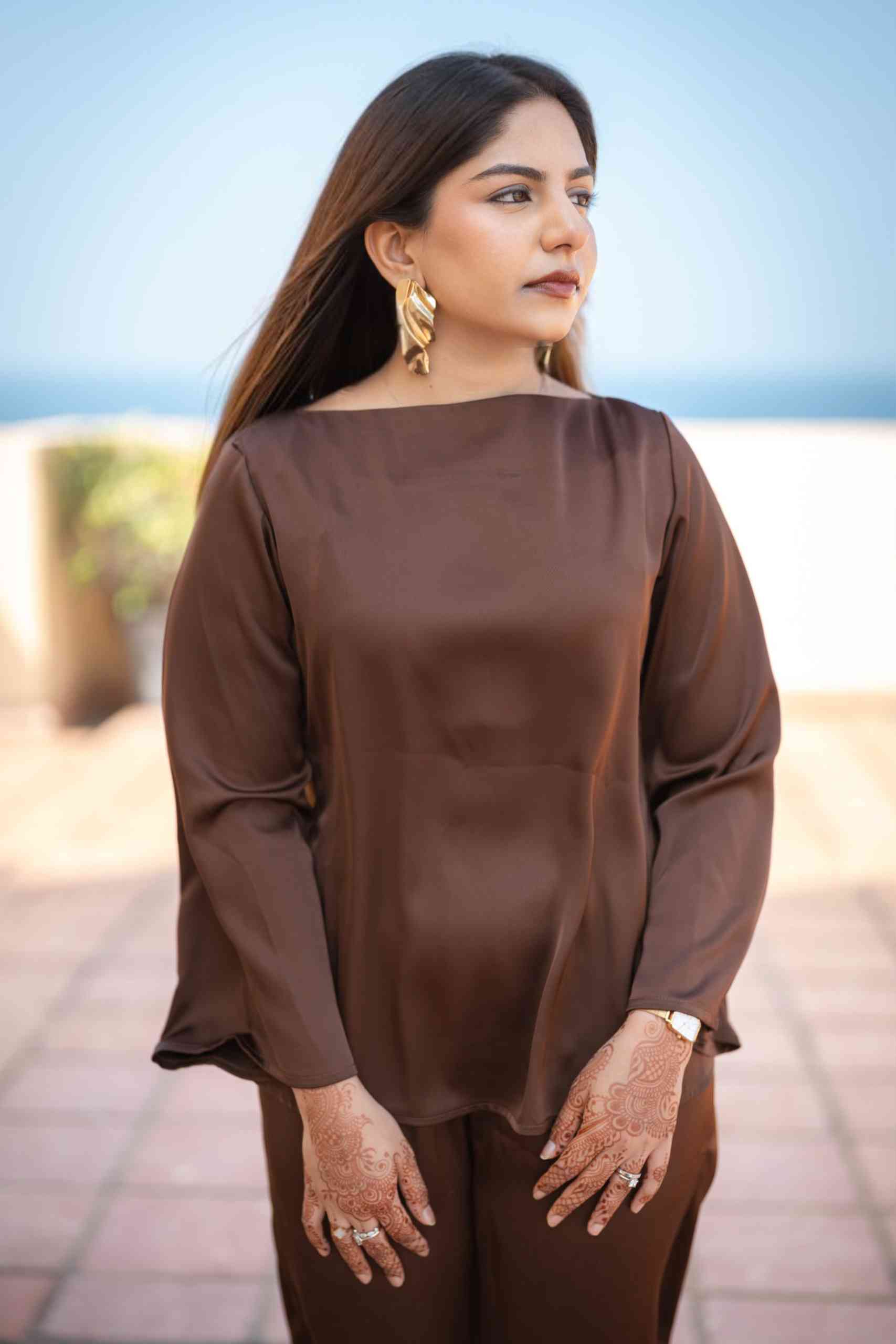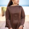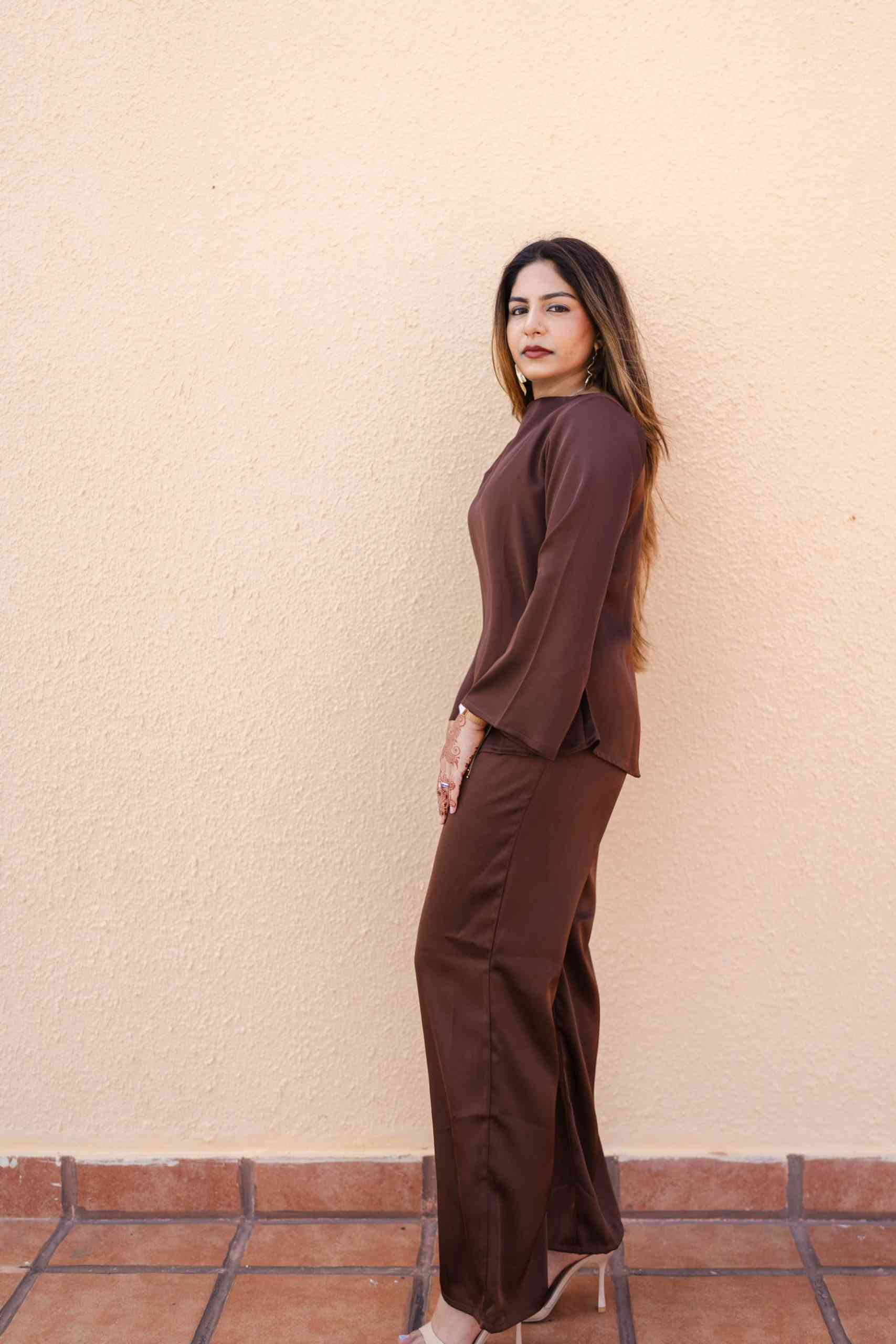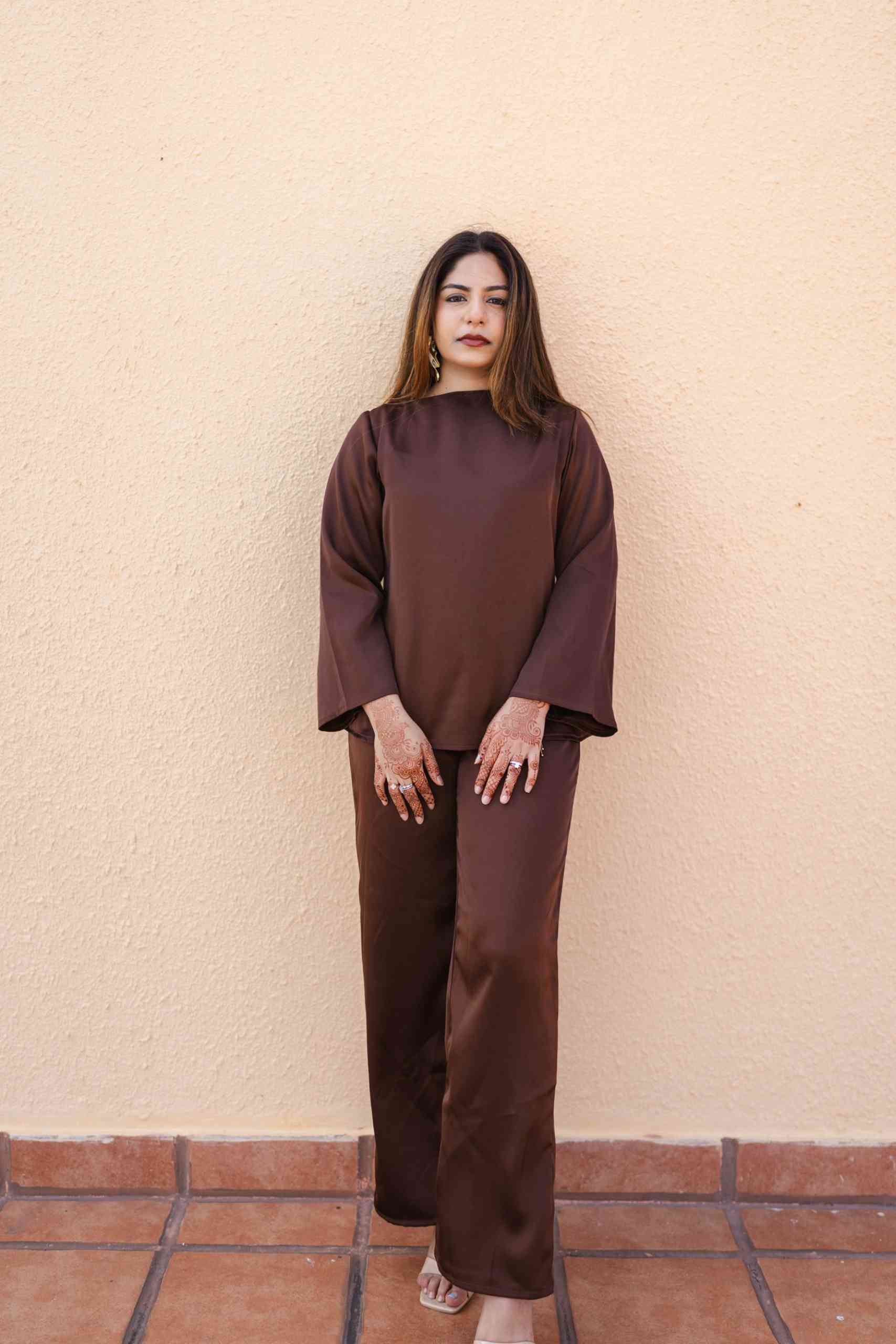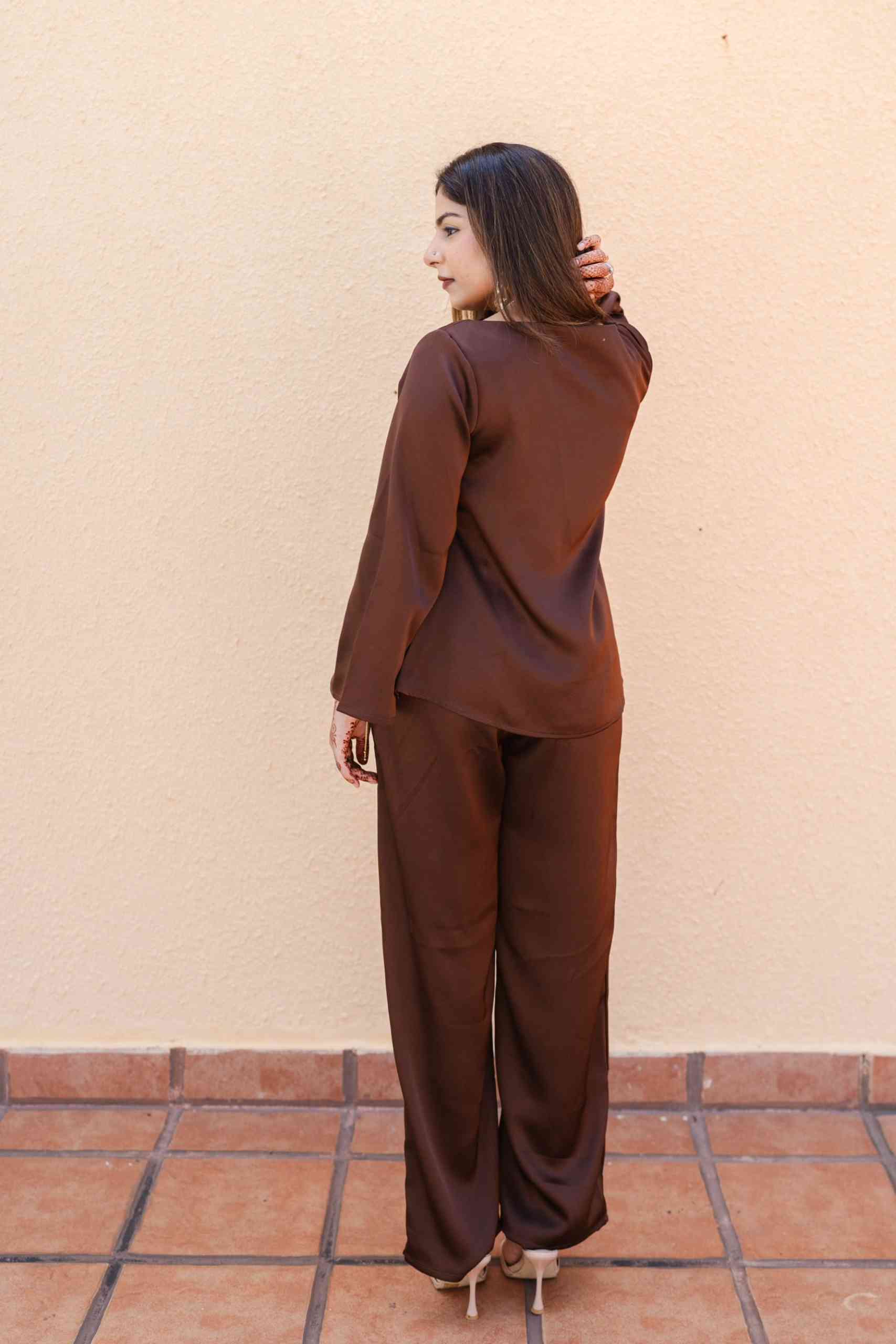 A minimal yet elegant chocolate brown satin co-ord set featuring a relaxed top with wide sleeves and straight-cut trousers. Perfect for effortless sophistication from day to evening.
