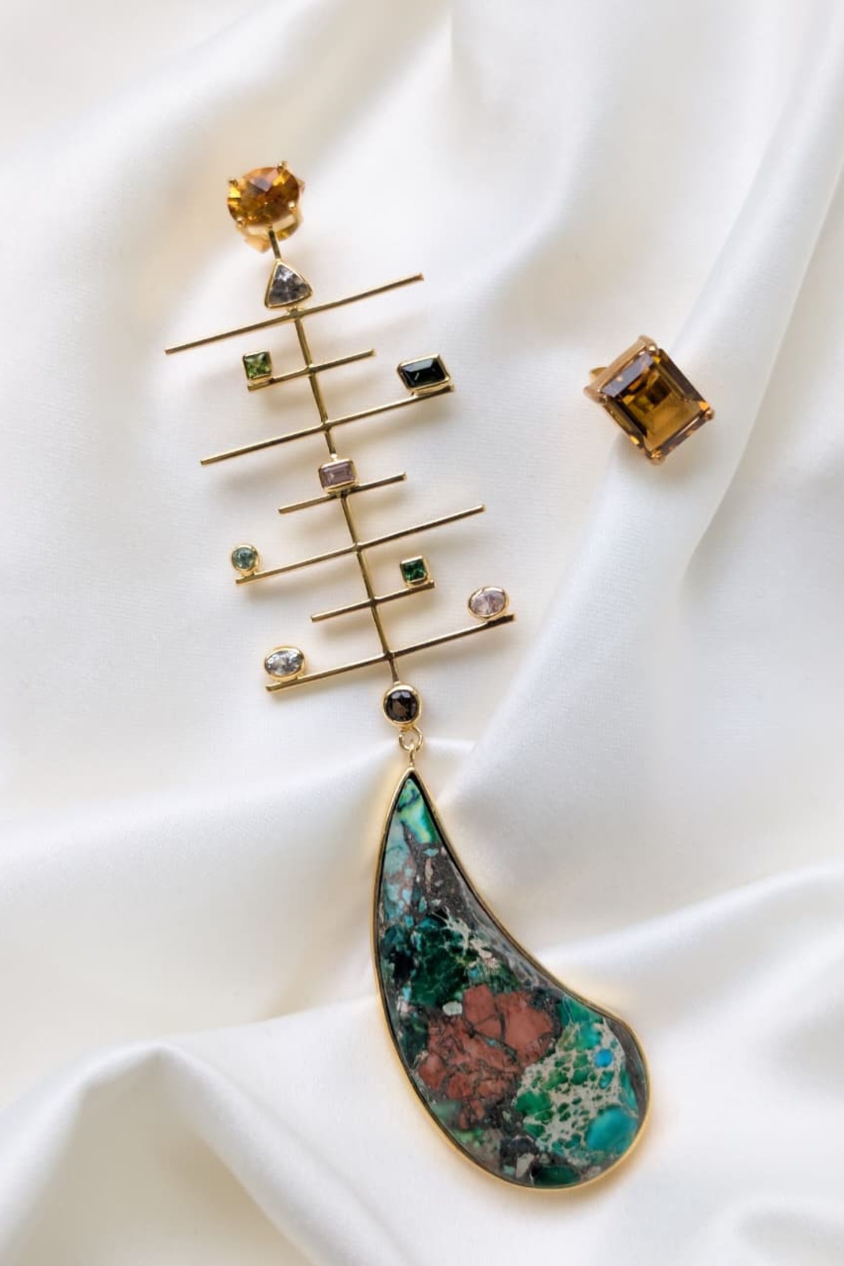 Sterling Silver 18K Gold Plated Earrings(only side long and other side has the stud) with Multi-colour Tourmalines & Green Jasper with a Citrine Stud.