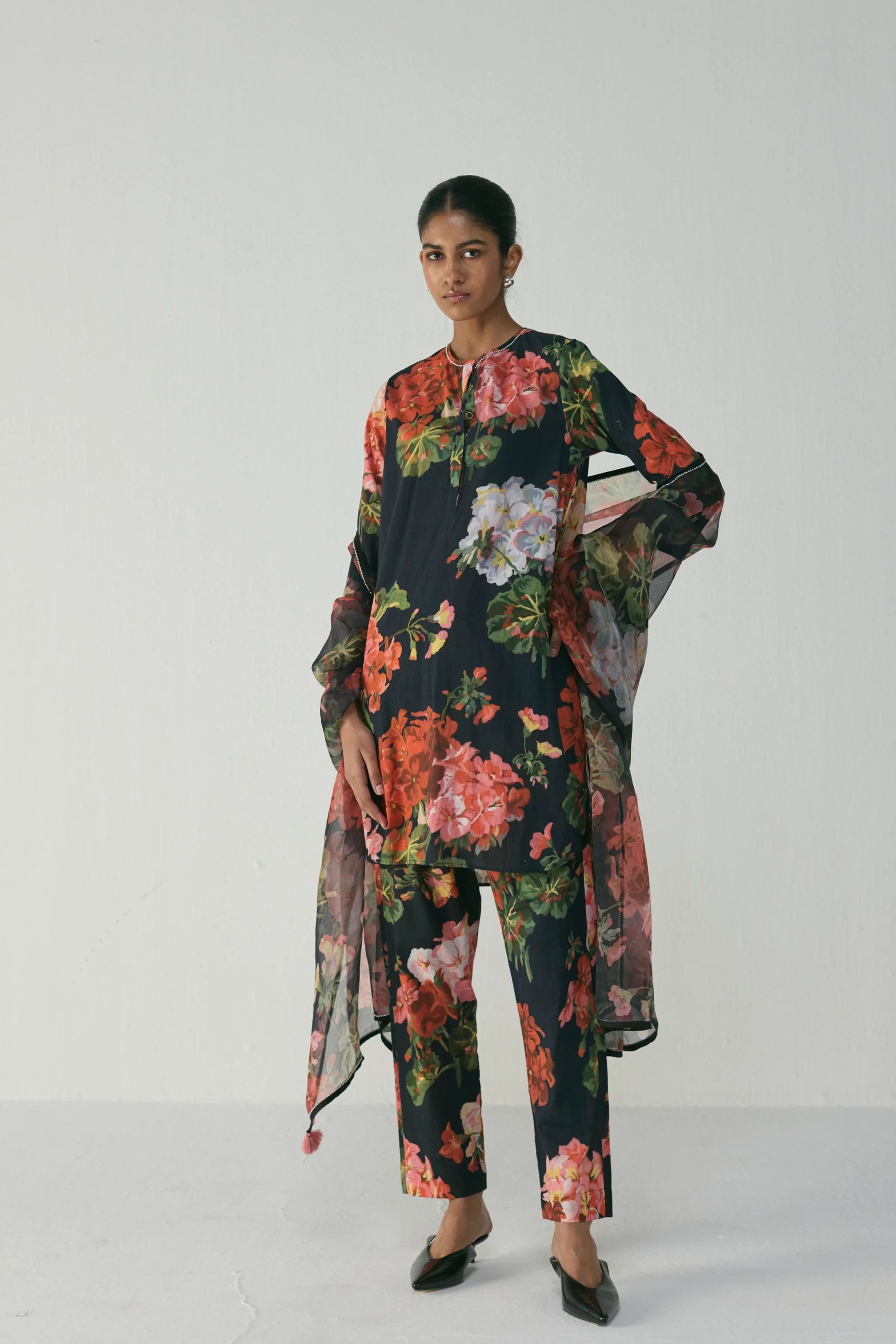 This striking floral kurta set showcases a bold play of blooms in vibrant red, blush, and green hues against a deep black base. Crafted in soft crepe fabric, it offers a fluid drape and effortless sophistication.