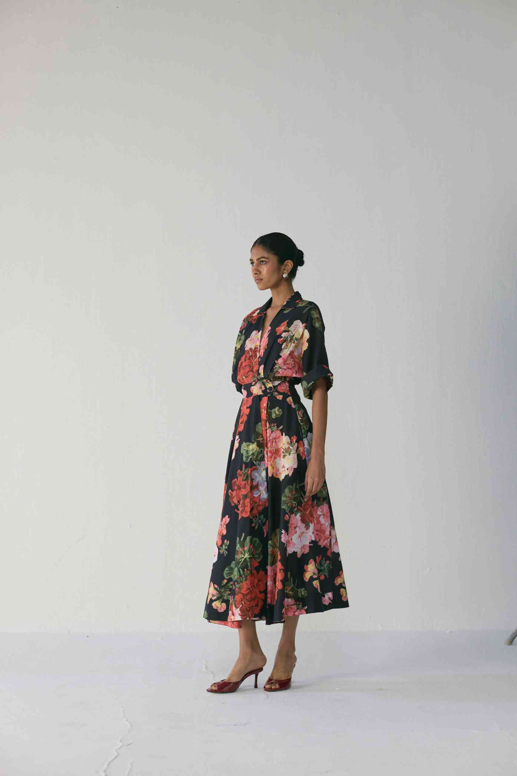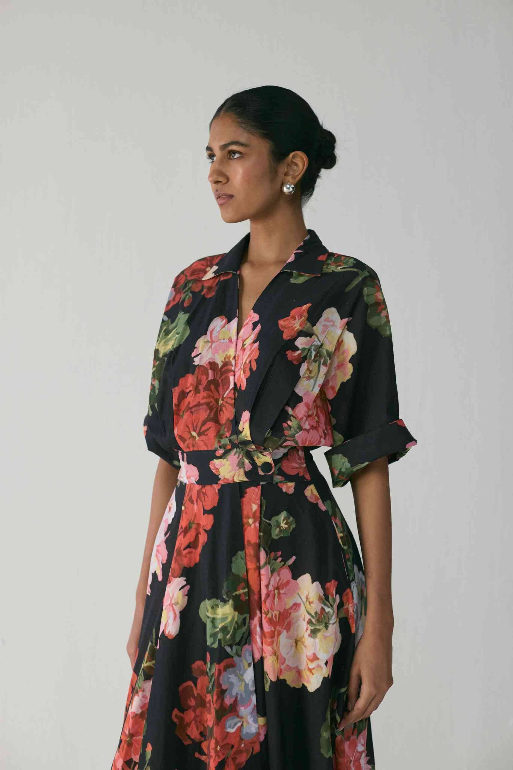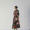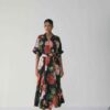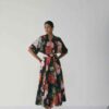 The vivid floral print in red, blush, and green tones set against a deep black base adds a bold yet sophisticated charm. Perfect for both day events and evening soirées, this piece redefines classic florals with contemporary flair.