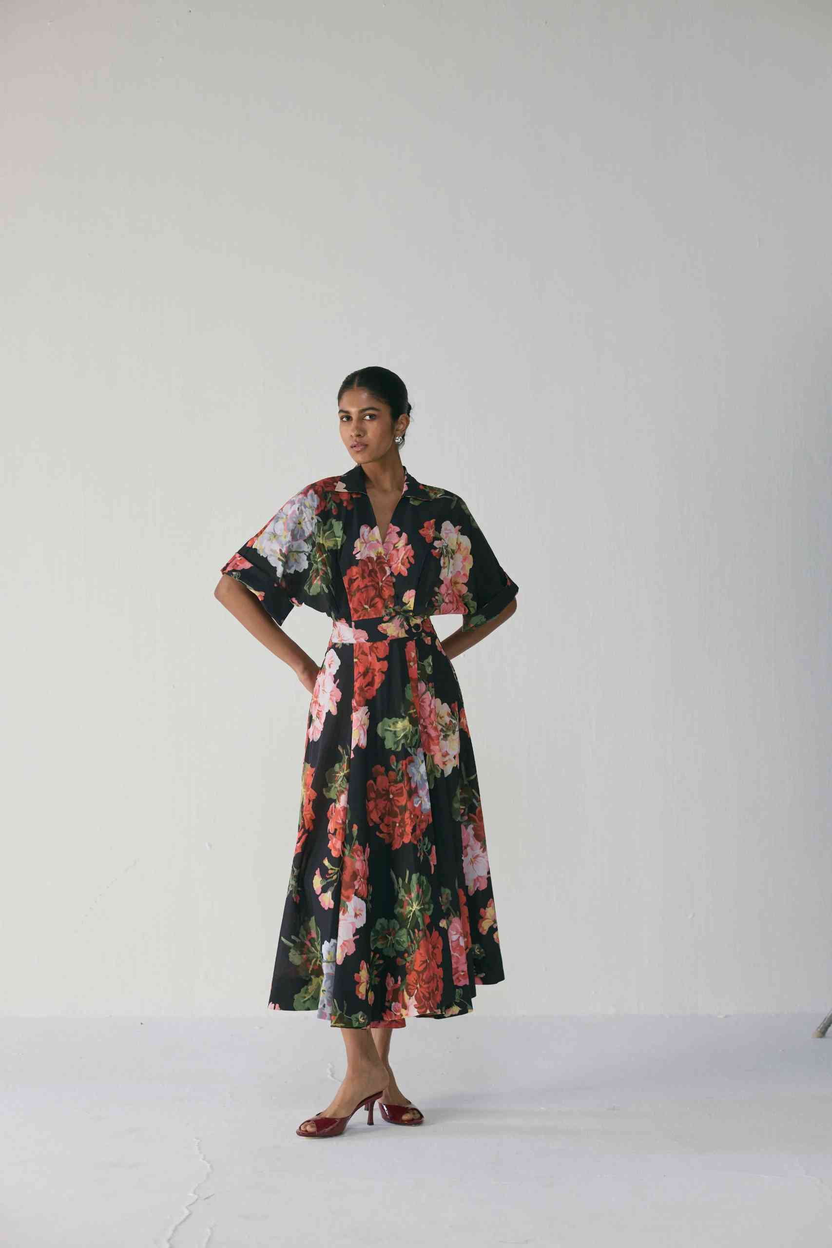 This floral shirt dress is crafted in crisp poplin fabric that beautifully balances structure with fluidity. Featuring a collared neckline, half sleeves with rolled cuffs, and a flattering fit-and-flare silhouette, this dress is both versatile and effortlessly chic.
