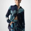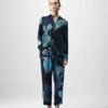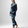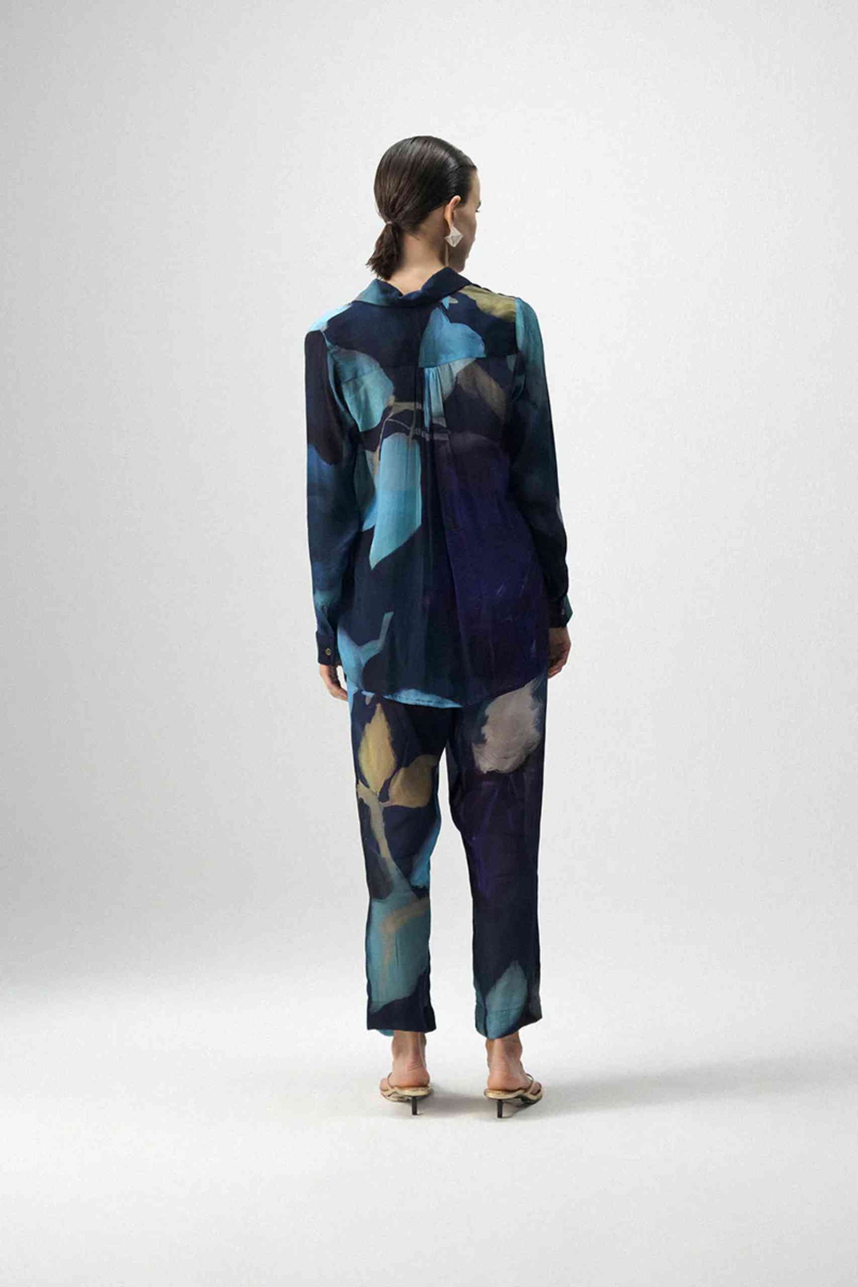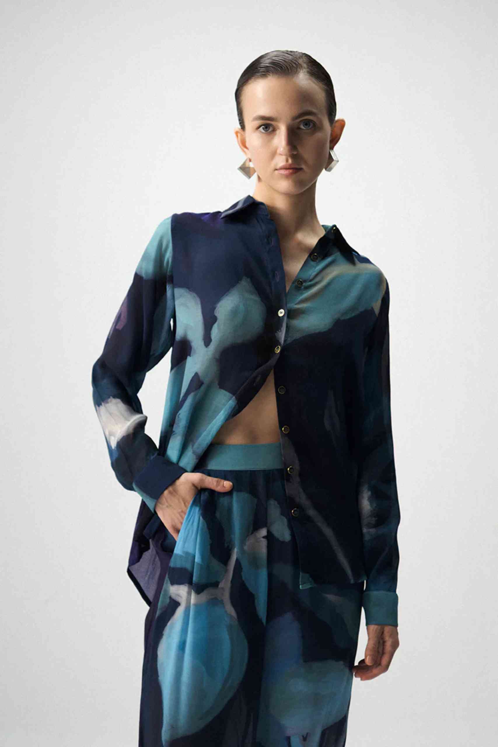 The co-ord set offers a seamless blend of comfort and elevated style. Crafted in luxurious crepe fabric, it features a fluid drape and a soft, silky touch that enhances both movement and silhouette. The set showcases a bold hand-painted-inspired abstract print in shades of deep blue and turquoise, creating a striking visual appeal that exudes contemporary elegance.