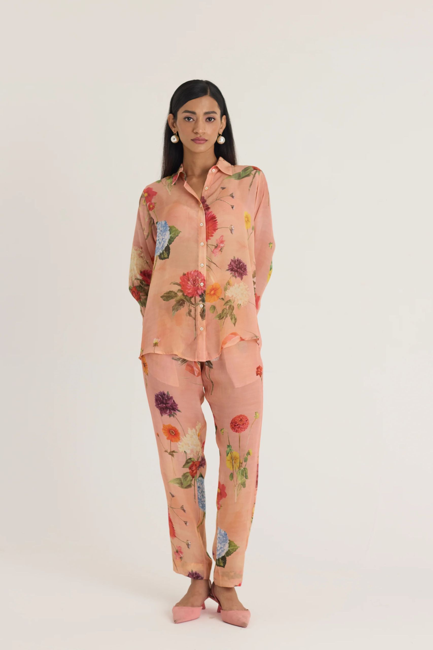 Pair this floral set with minimal pearl or gold jewelry and neutral-toned footwear for an effortlessly graceful look.