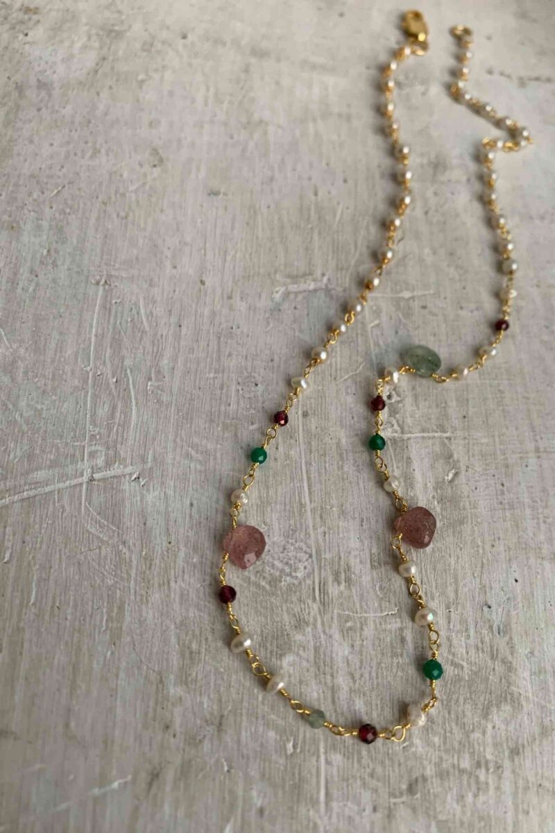 This Cherry quartz necklace is handcrafted with chalcedony and pearls. It measures 17 inch in length and adds a touch of elegance with its stunning pendant.