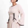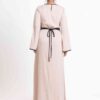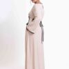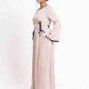 A sophisticated modest dress in a timeless cream tone, accented with contrasting black details and delicate front-lace styling. Designed with a graceful, full-length silhouette and elegant coverage, it’s perfect for refined daywear or special occasions.