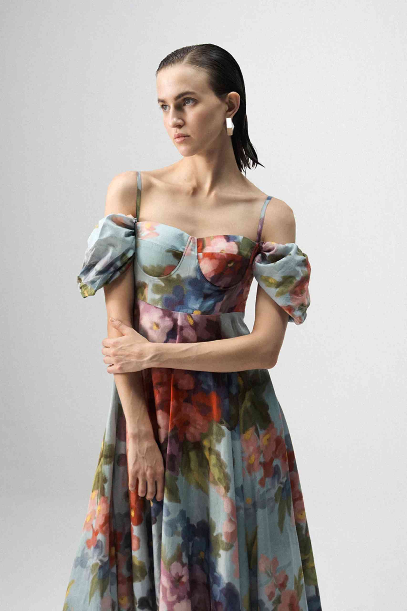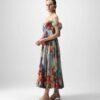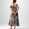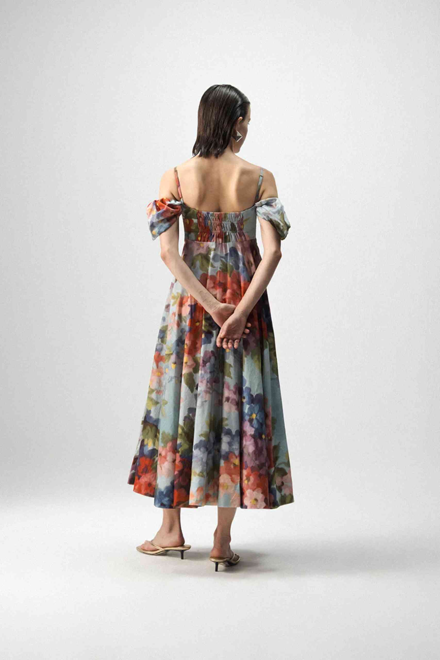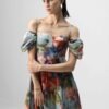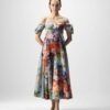 The off shoulder Dress captures the essence of romantic elegance with its fluid silhouette and painterly floral artwork. Crafted in cotton satin fabric, the dress features a mesmerizing hand-painted floral-inspired digital print in vivid shades of coral, violet, moss green, and sky blue.