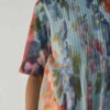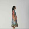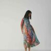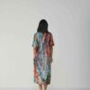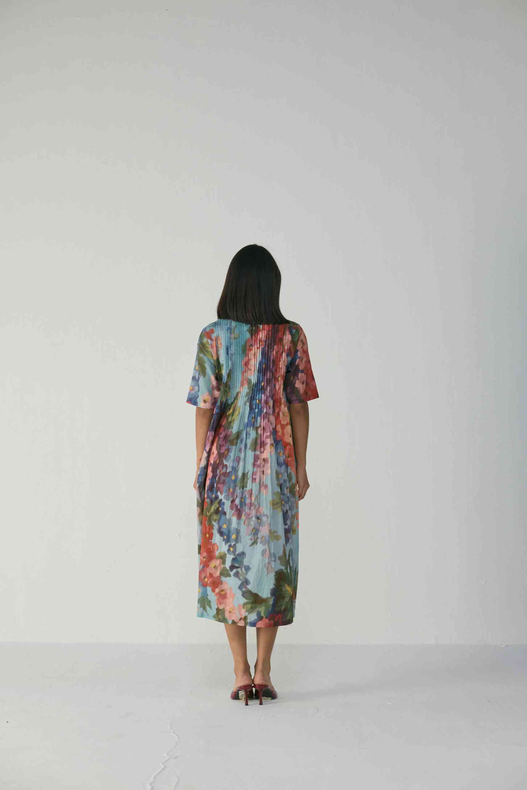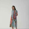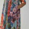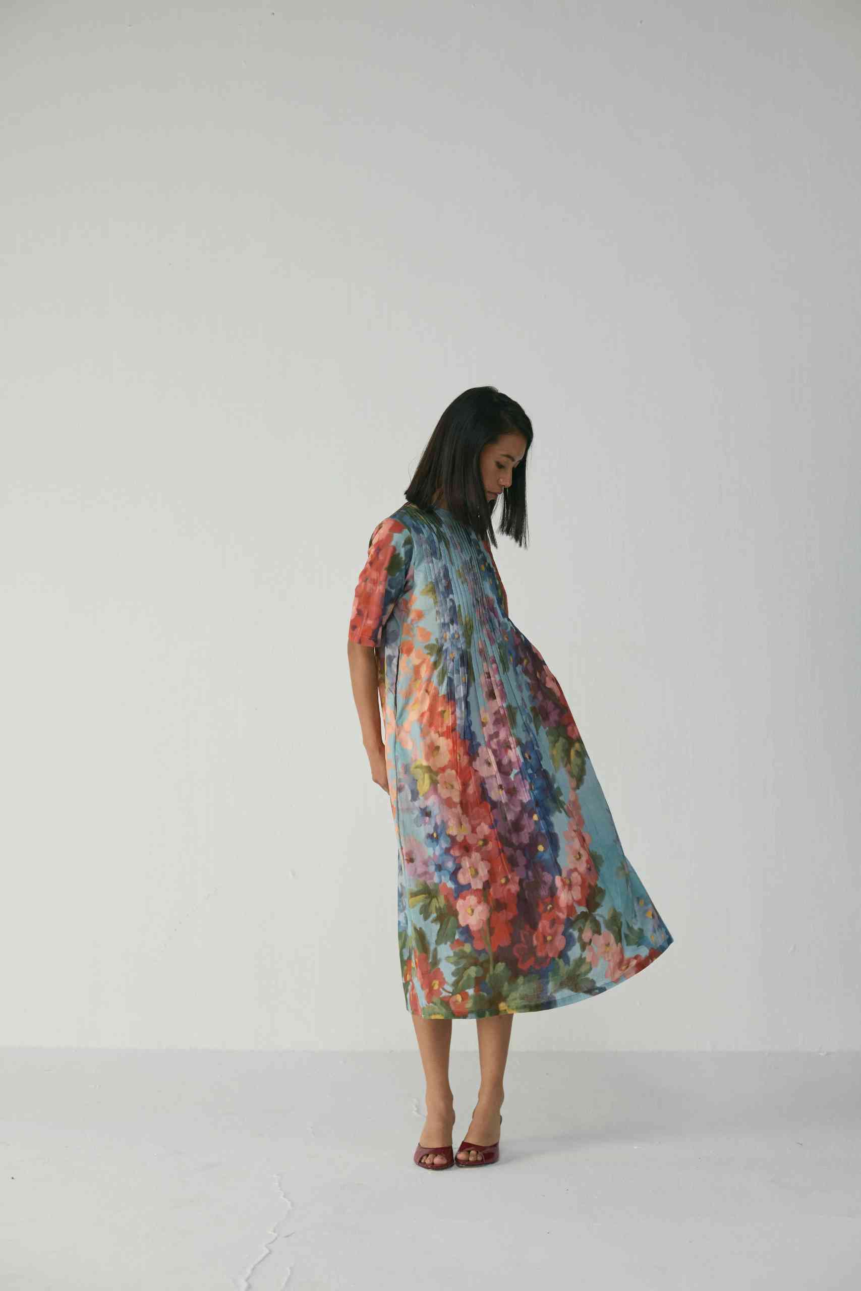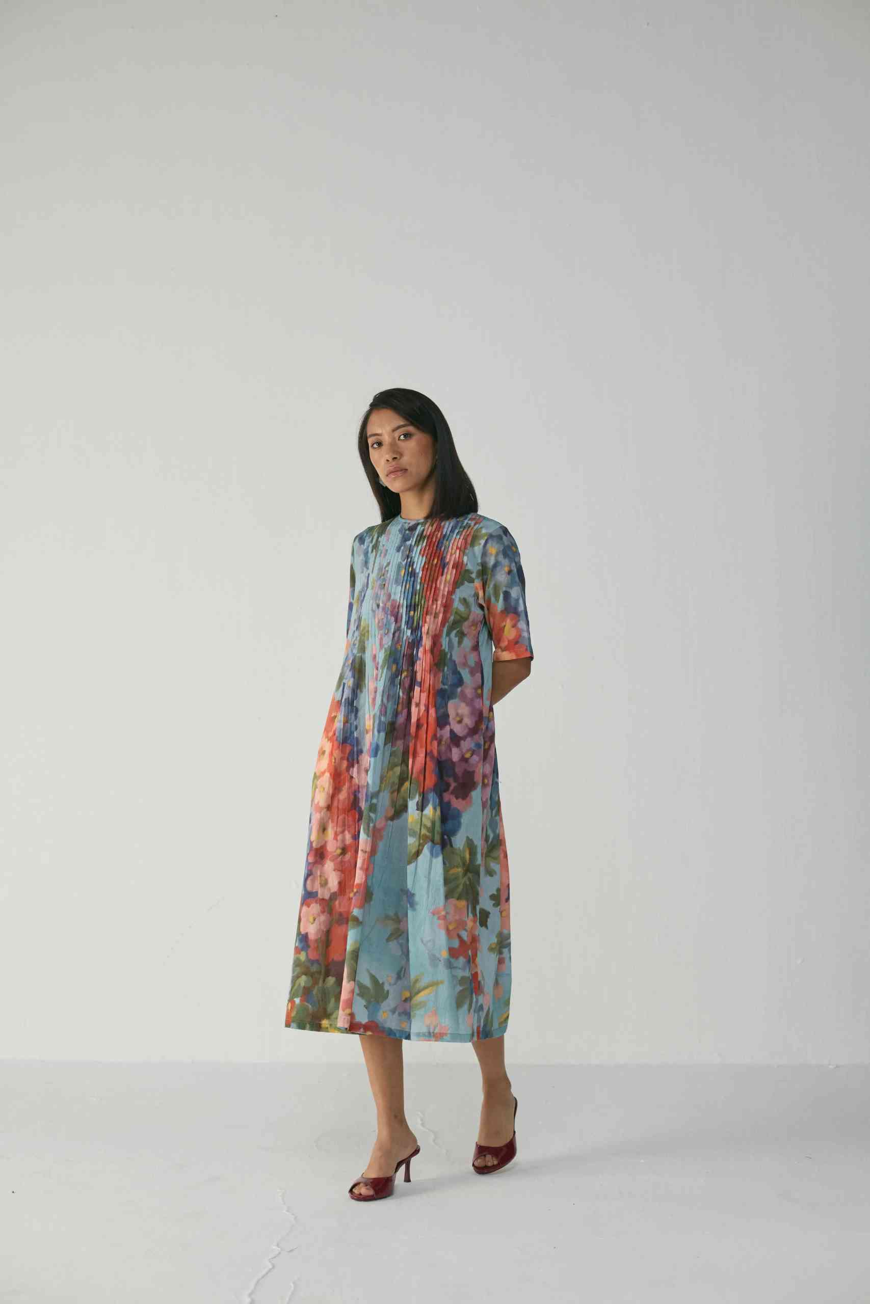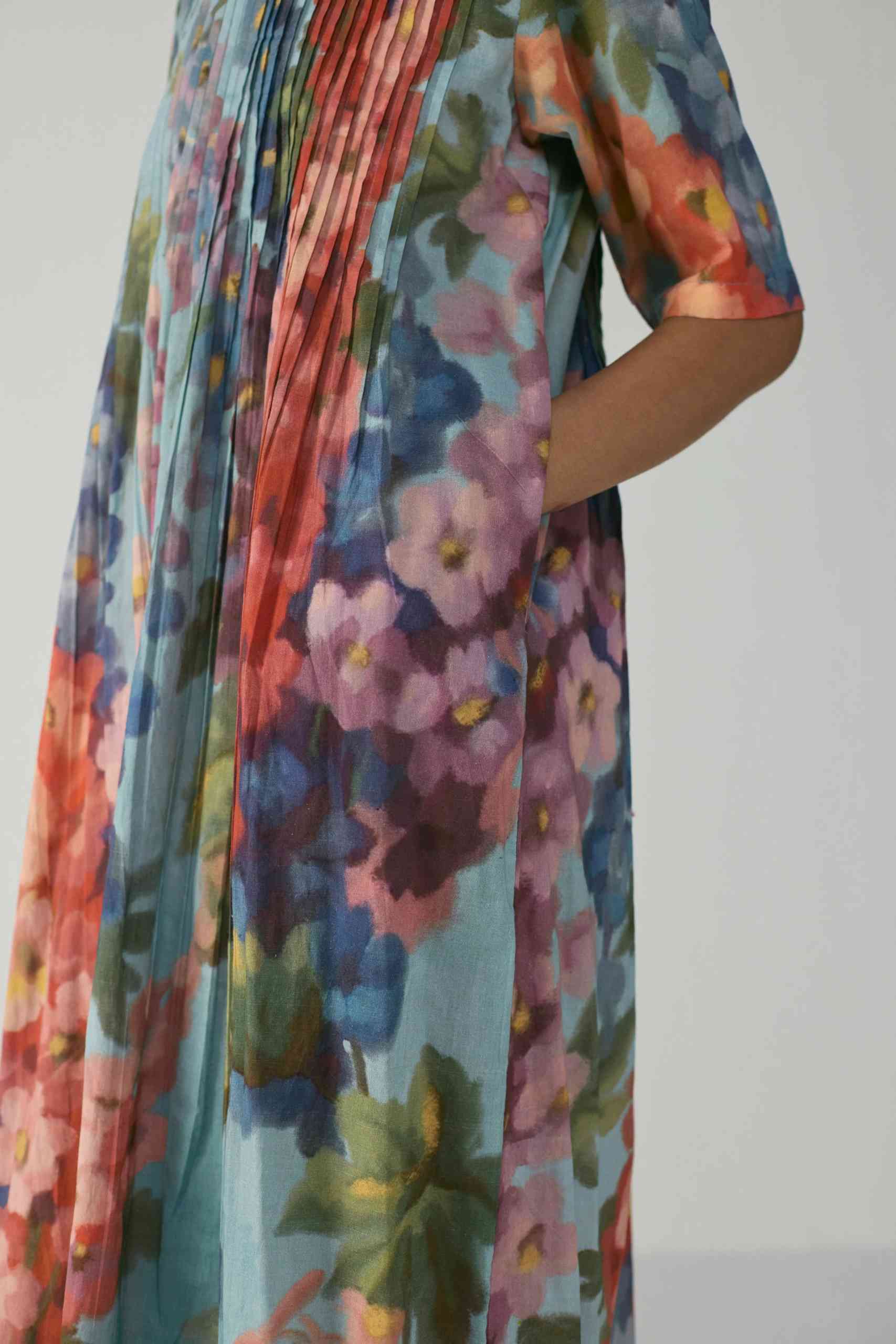 Crafted in a lightweight and breathable Cotton fabric , this dress features an enchanting hand-painted floral-inspired digital print that flows in shades of coral, indigo, lilac, and moss green over a soft blue canvas. The front and back pleated panel detailing adds a graceful structure to the silhouette, allowing movement and texture while maintaining an effortless drape.