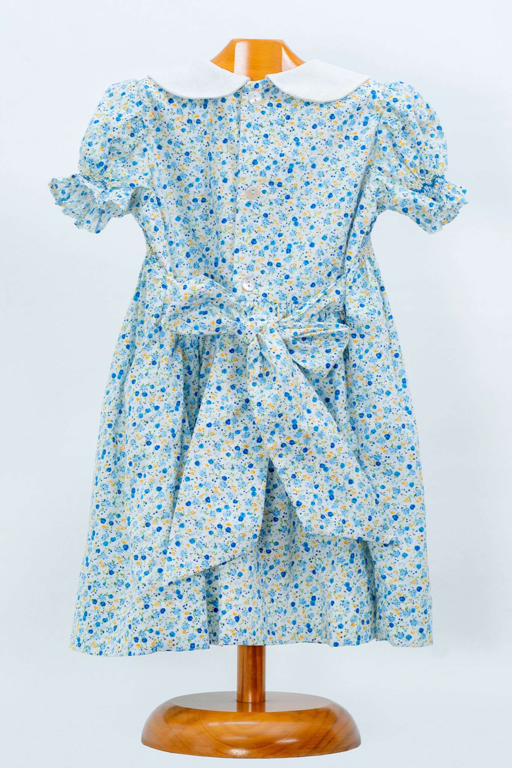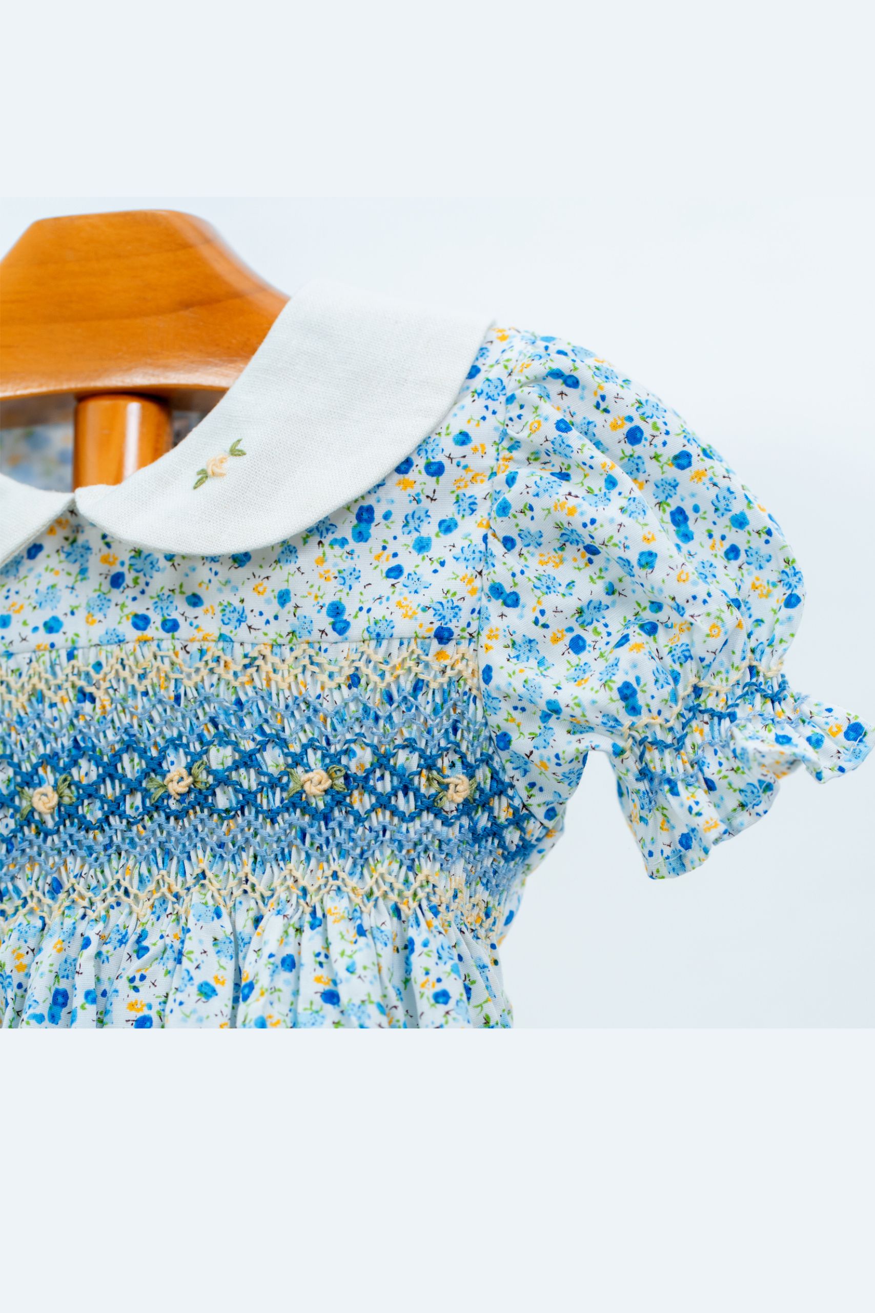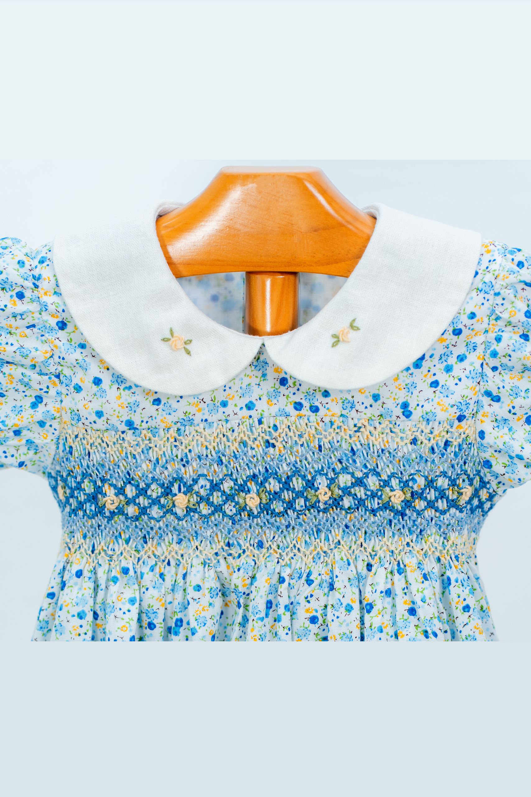 The Emily dress is designed for a little one who deservers something truly special! This dainty dress features a beautiful floral pattern in dark blue, light blue and yellow that evokes the beauty of blossoms in a garden. The hand smocked bodice is skillfully crafted in coordinating shades of dark blue, light blue and pastel yellow creating a harmonious and eye catching design. The off white peter pan collar features pastel yellow roses. The tie at the back with a button down opening to the waist ensures an adjustable fit that’s as practical as it’s stylish. The dress is lined in cotton offering both comfort and durability for your little ones adventures.
