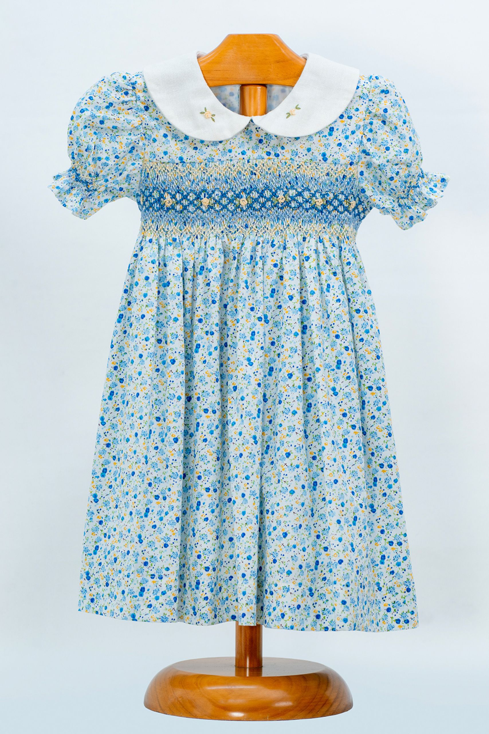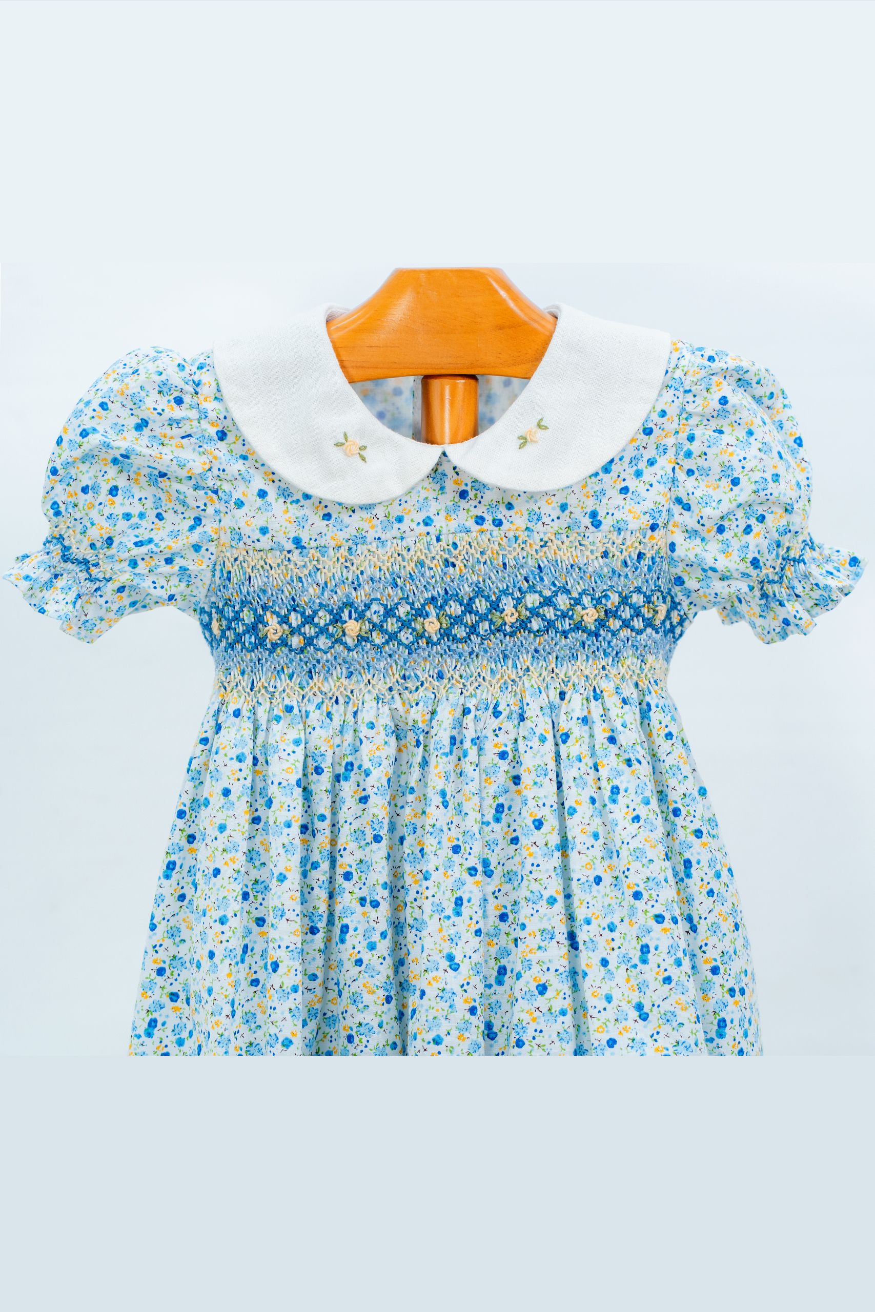 - Beautiful floral dress with hand smocked bodice with dainty hand embroidered flowers