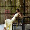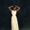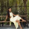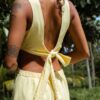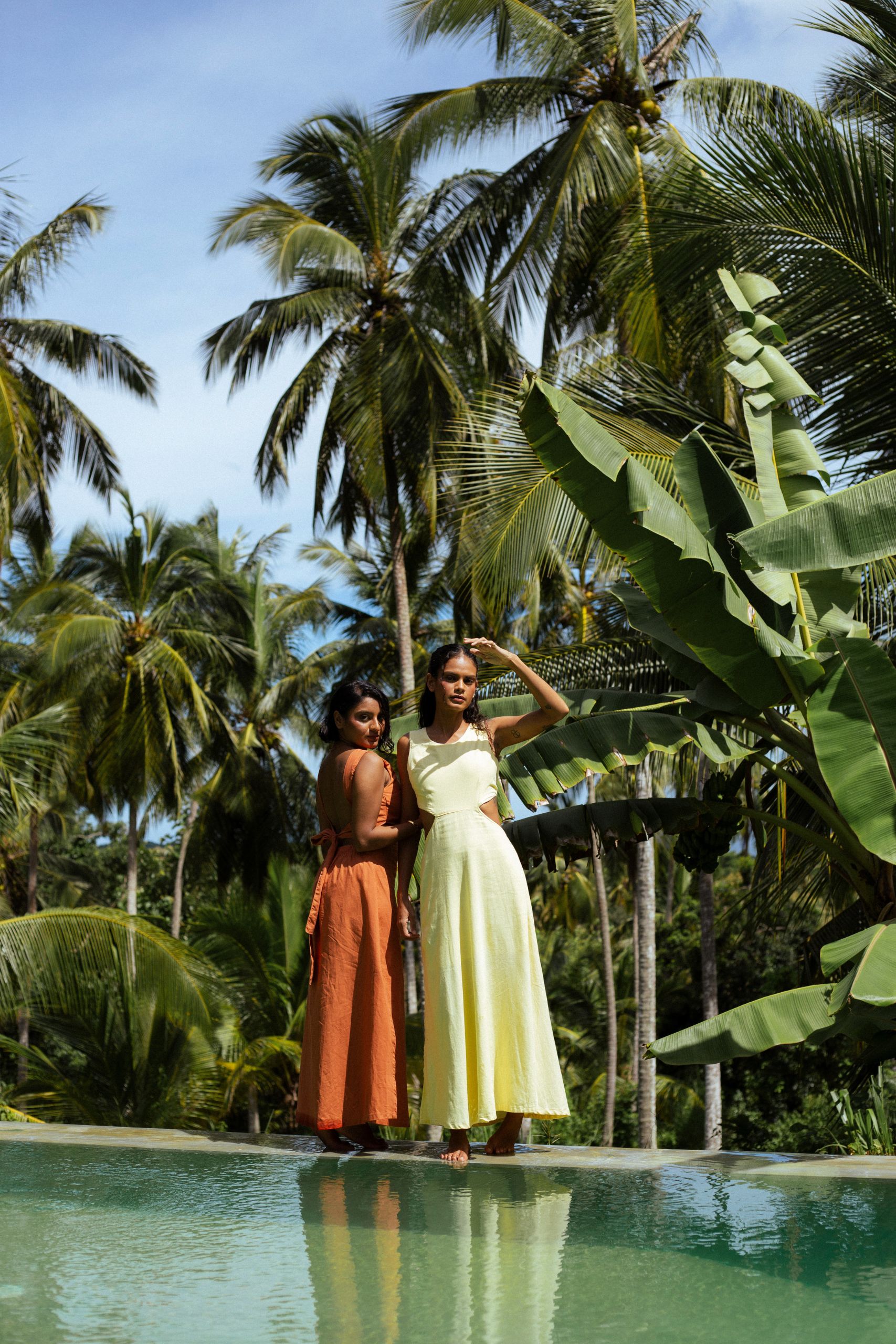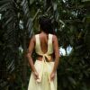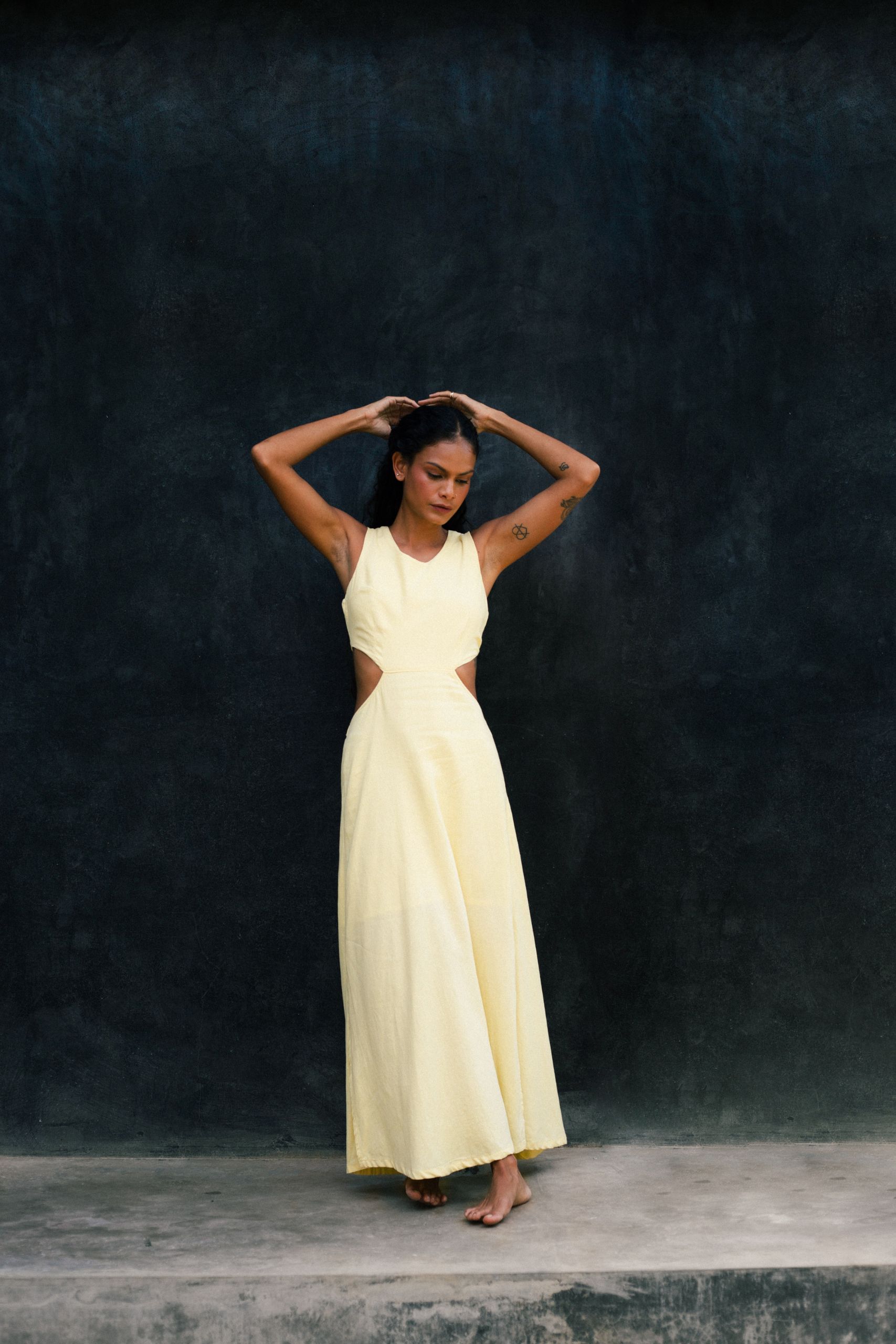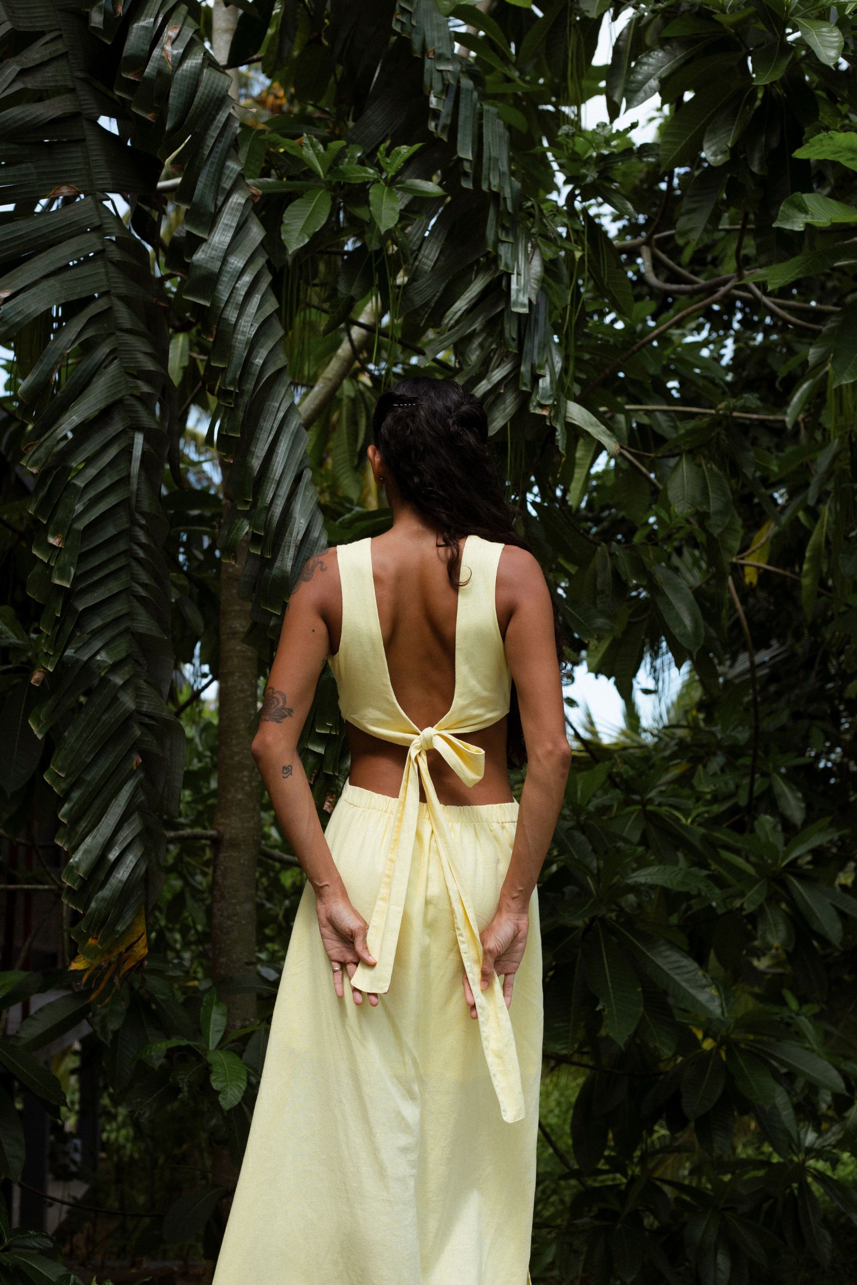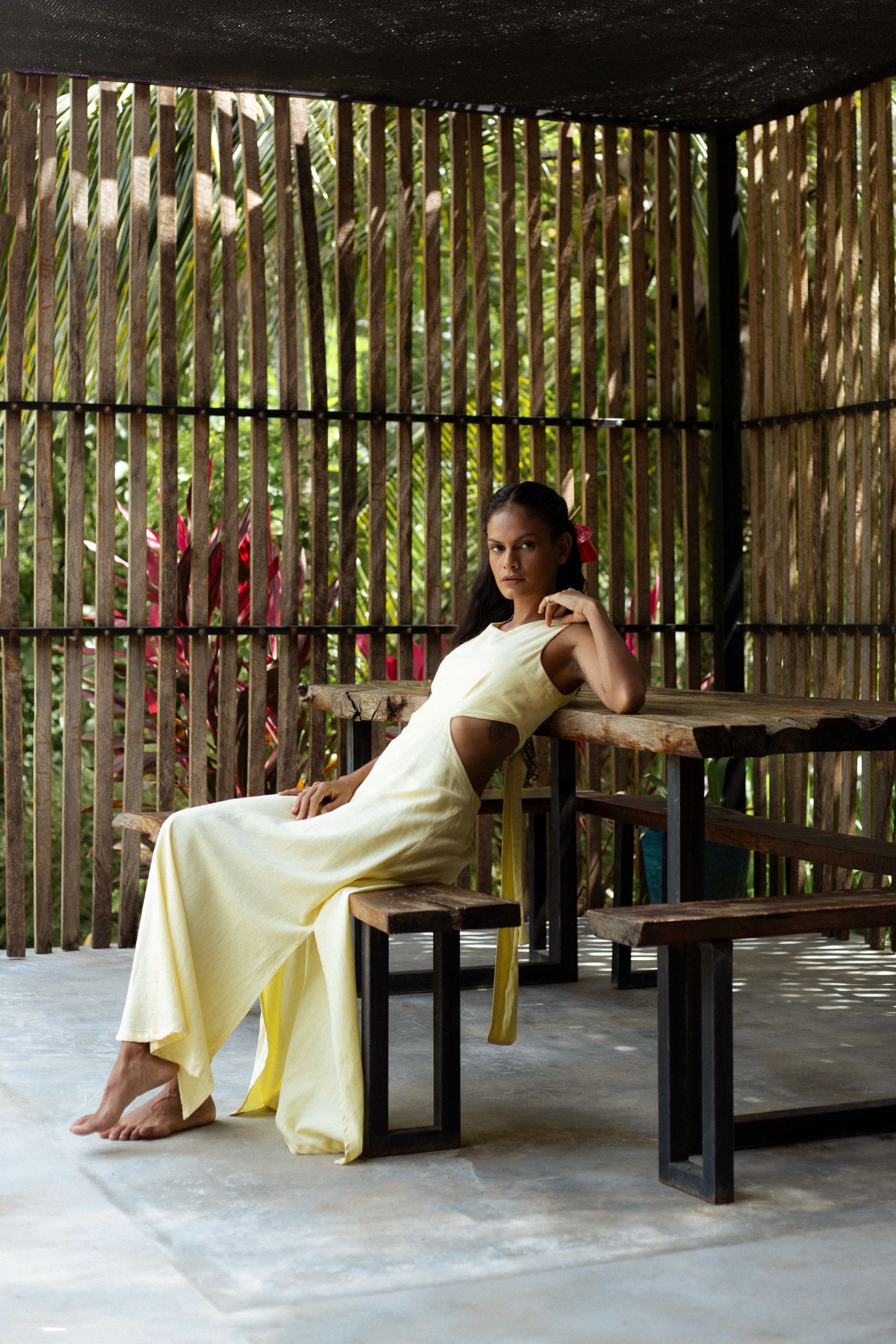 The Faya dress is fresh and elegant, with just the right touch of sexy, slit at the sides and open and tied at the back. It can be worn with a bra. Handmade in linen and cotton blend.