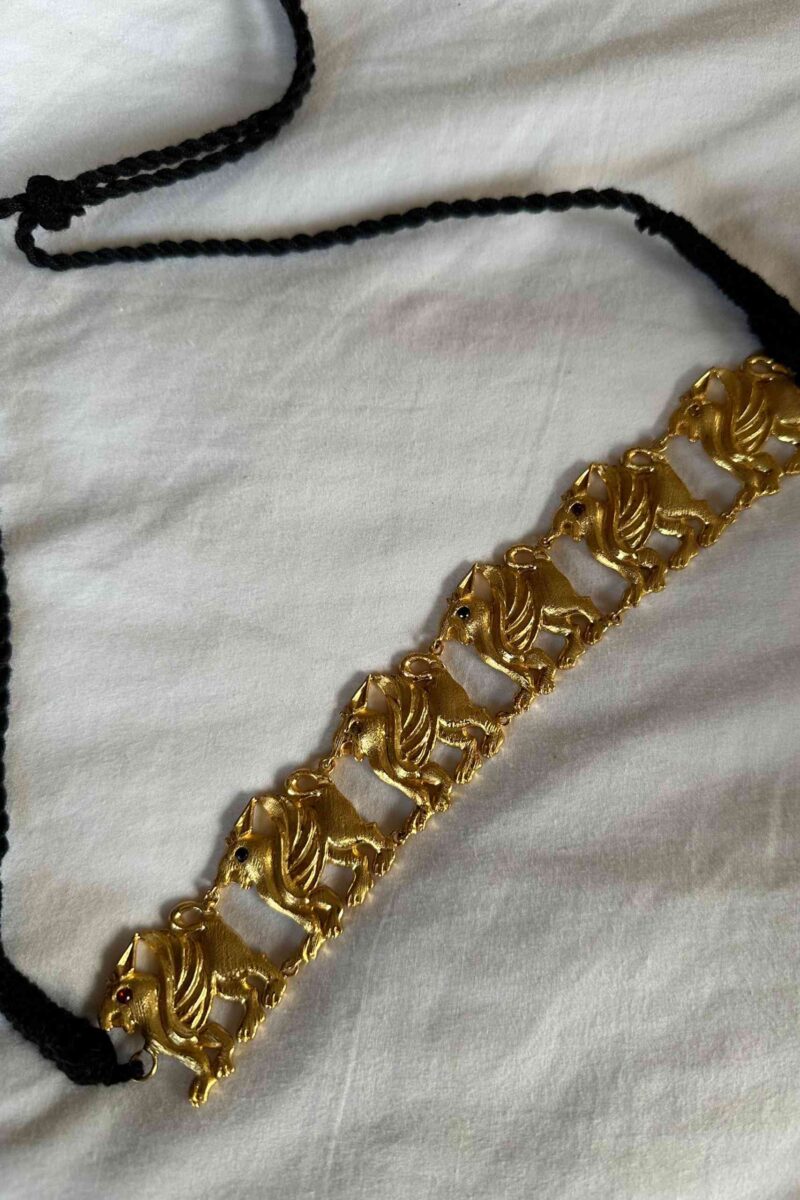 The Garud necklace is crafted from brass and coated in luxurious gold. Its exquisite design makes it a striking accessory to your jewelry collection.