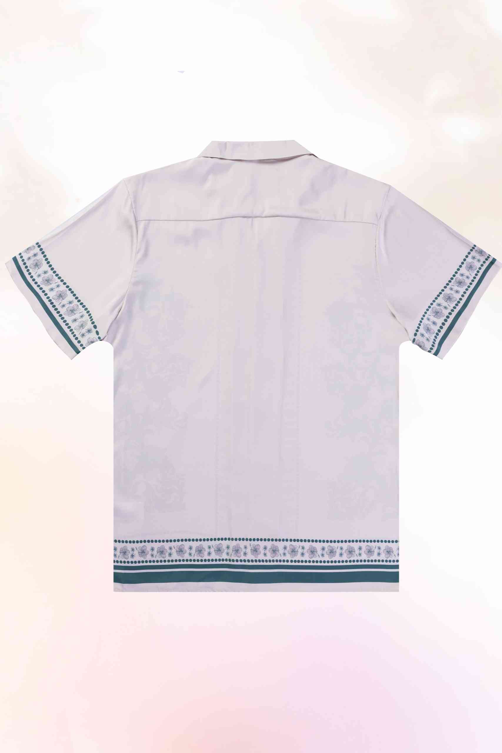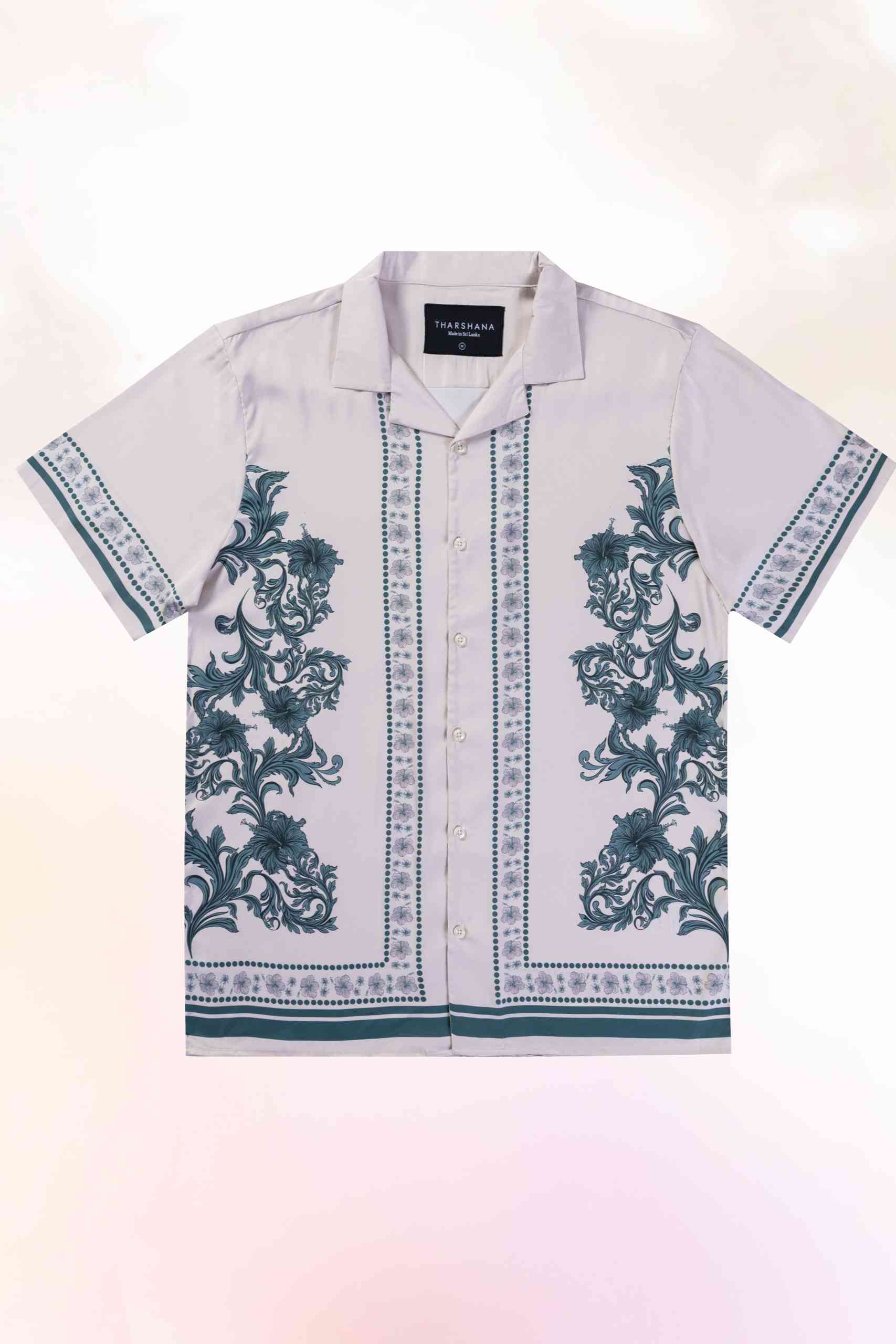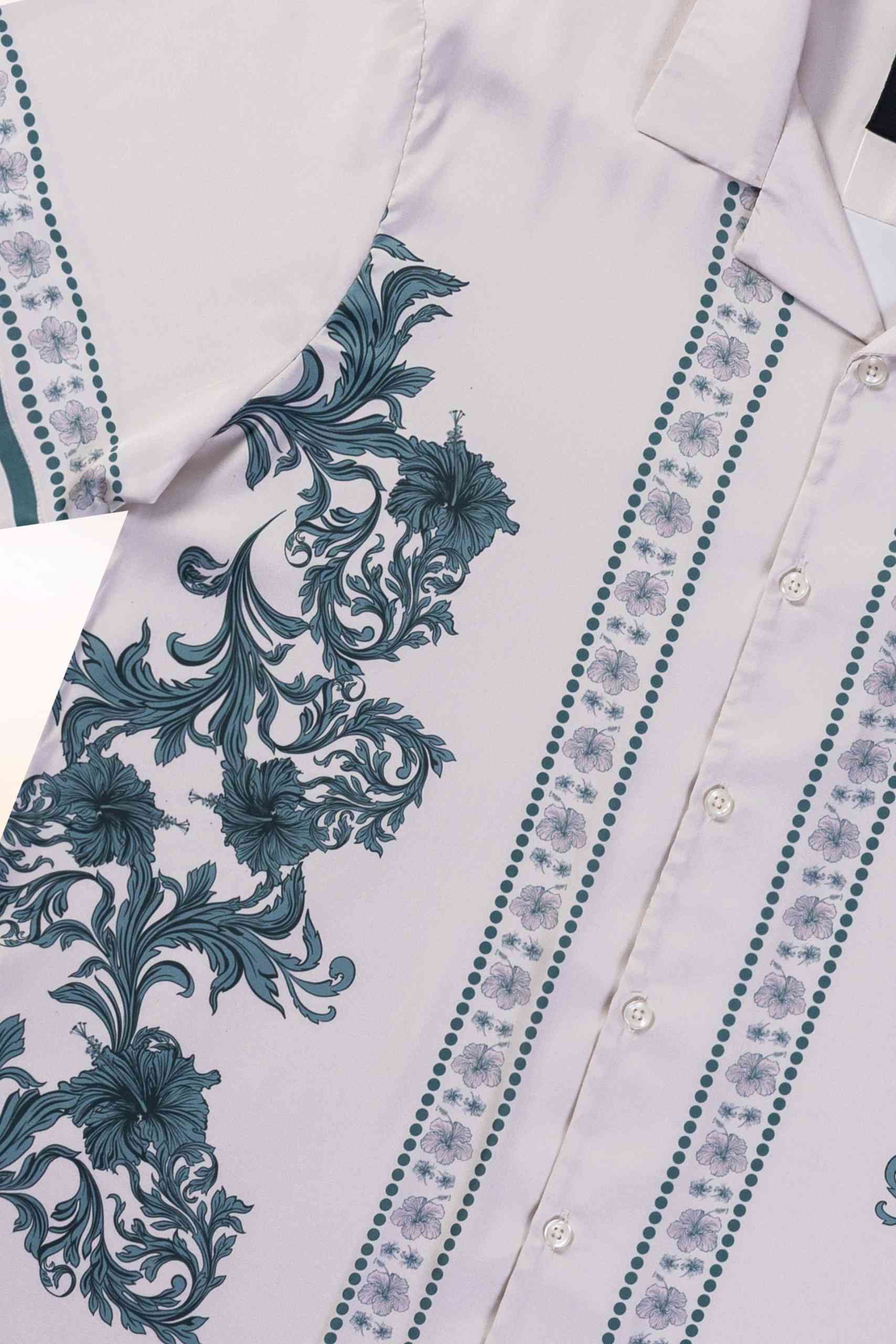 The hibiscus elements are integrated into the flowing baroque lines, creating a balance between structure and softness. Borders and panels are placed deliberately to align through the seams, giving the shirt a clean, architectural finish.