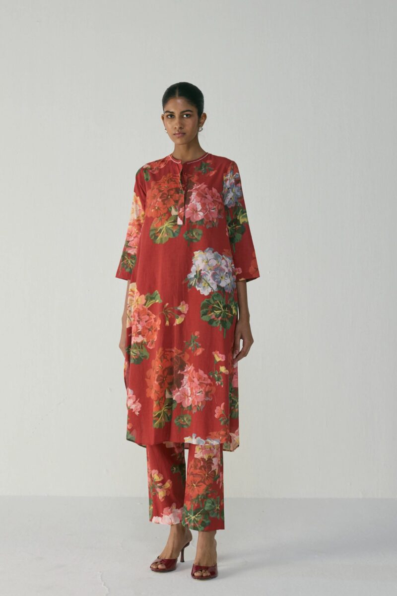 A vibrant ode to timeless botanical artistry, this print features hand-painted florals in full bloom, rendered in lush shades of crimson, blush pink, lilac, and verdant green. Set against a rich red base, the cascading flowers create a romantic yet contemporary expression, blending vintage elegance with modern sophistication. The placement of the florals is thoughtfully balanced, giving the ensemble a refined, painterly charm that stands out effortlessly.