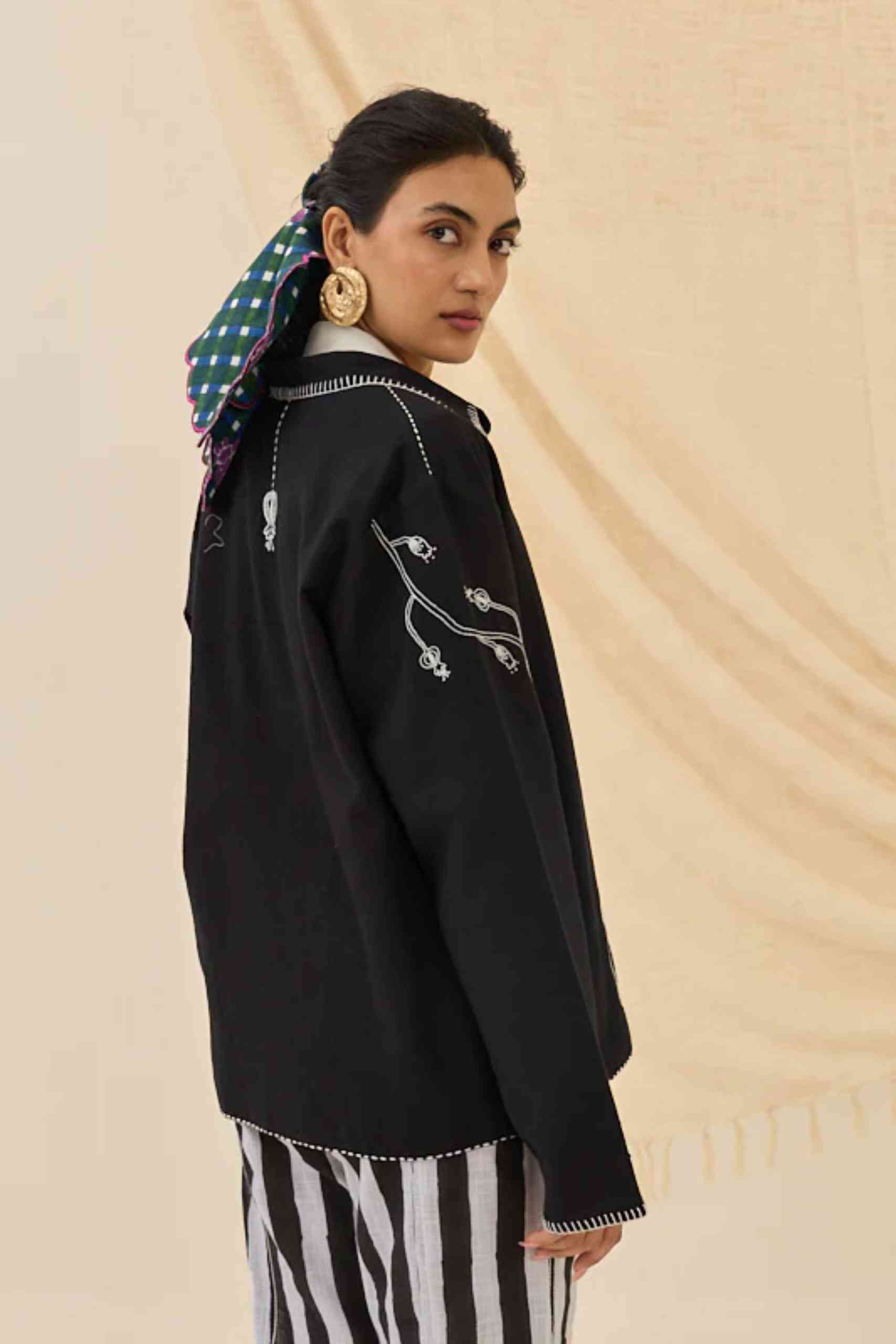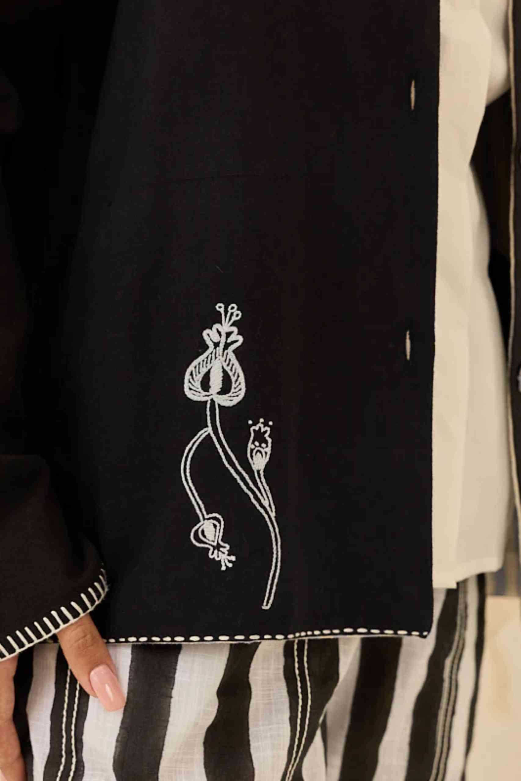 A relaxed, handwoven cotton jacket featuring our signature white folk-inspired embroidery. Designed with a button-down front, roomy sleeves, and contrast stitch detailing on the collar and hems, this piece adds an artisanal edge to any look. Layer it over your everyday separates for an effortlessly chic statement.