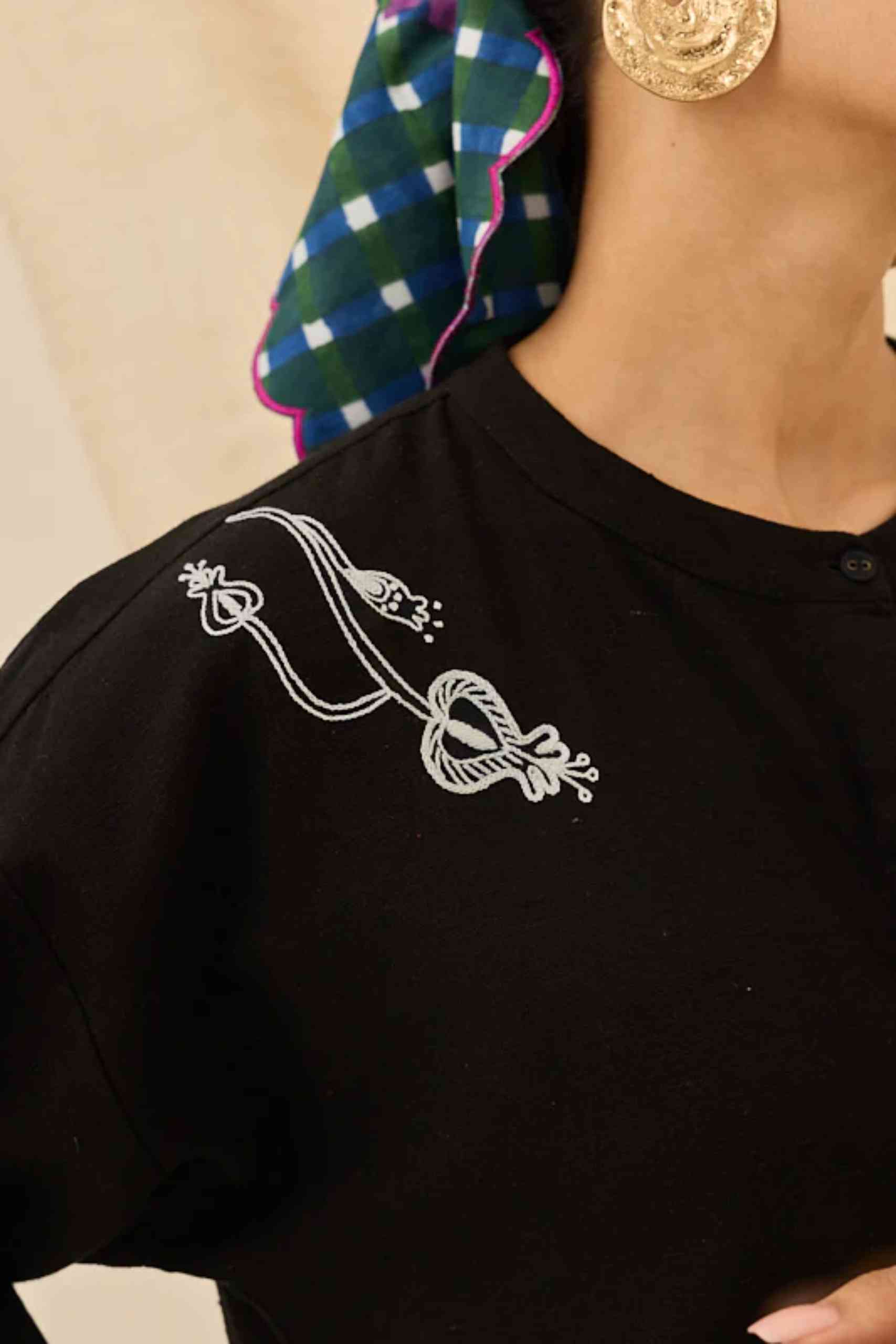 Cut from handwoven cotton, this kurta features a band collar, drop shoulders, and a hidden placket. Intricate white folk-inspired embroidery near the hem and shoulders adds a touch of artistry, blending minimalist design with Jodi’s handcrafted charm.
