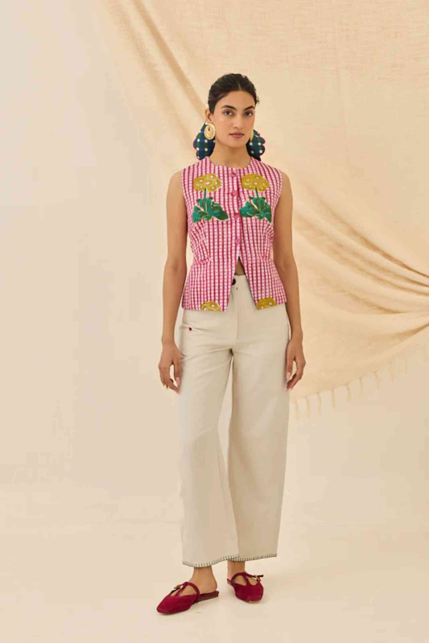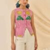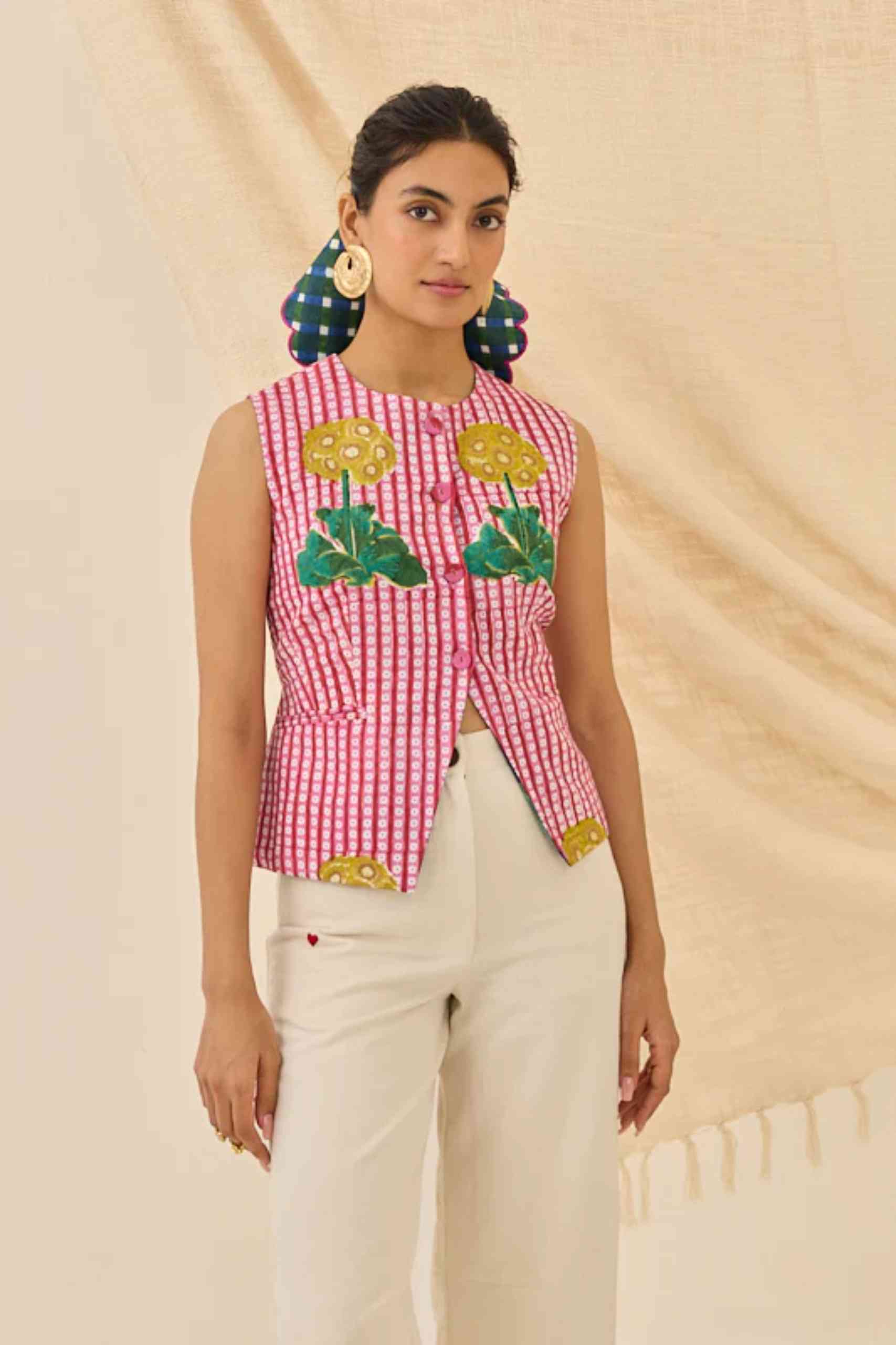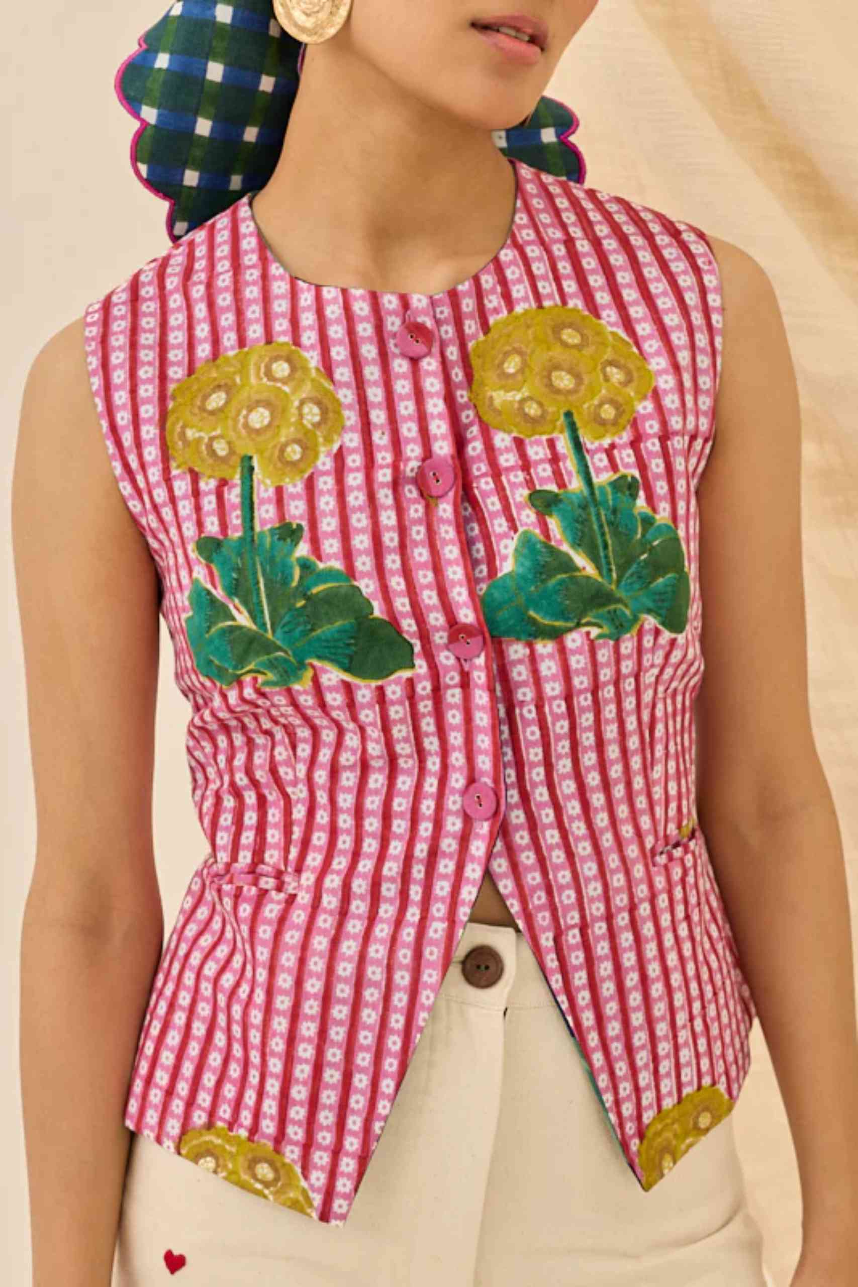 A vibrant, cropped waistcoat in a lively floral hand block print. This sleeveless vest features a round neck along with a button-front closure. The playful hem and detailed buttons make this a unique layering piece that celebrates traditional Indian block printing and vibrant color.