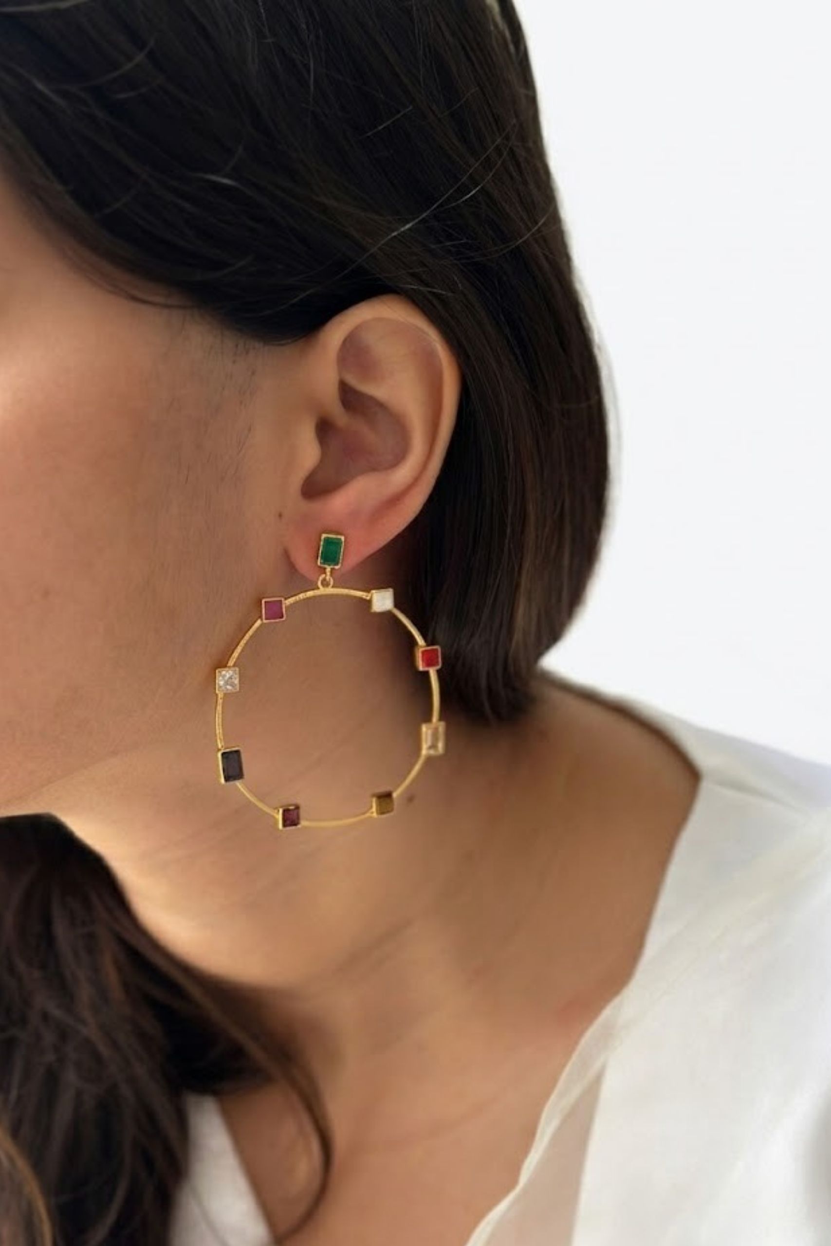 Add a touch of regal charm to your jewellery collection with these exquisite gemstone drop earrings, handcrafted in hallmarked 92.5 sterling silver and elegantly gold plated for a rich, lasting shine. Designed with a graceful 6.4 cm drop, these earrings make a refined statement—perfect for festive occasions, weddings, or standout everyday wear.