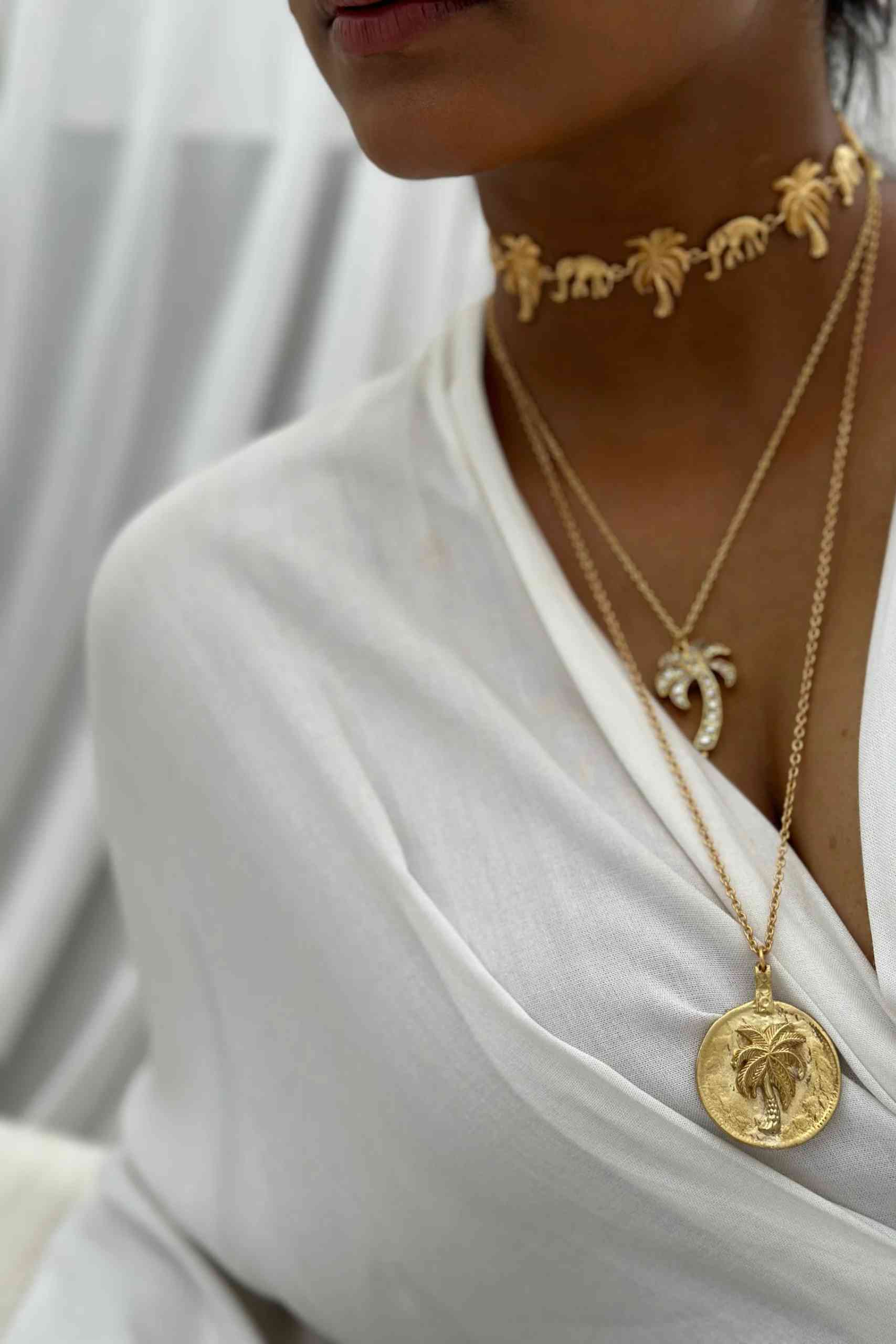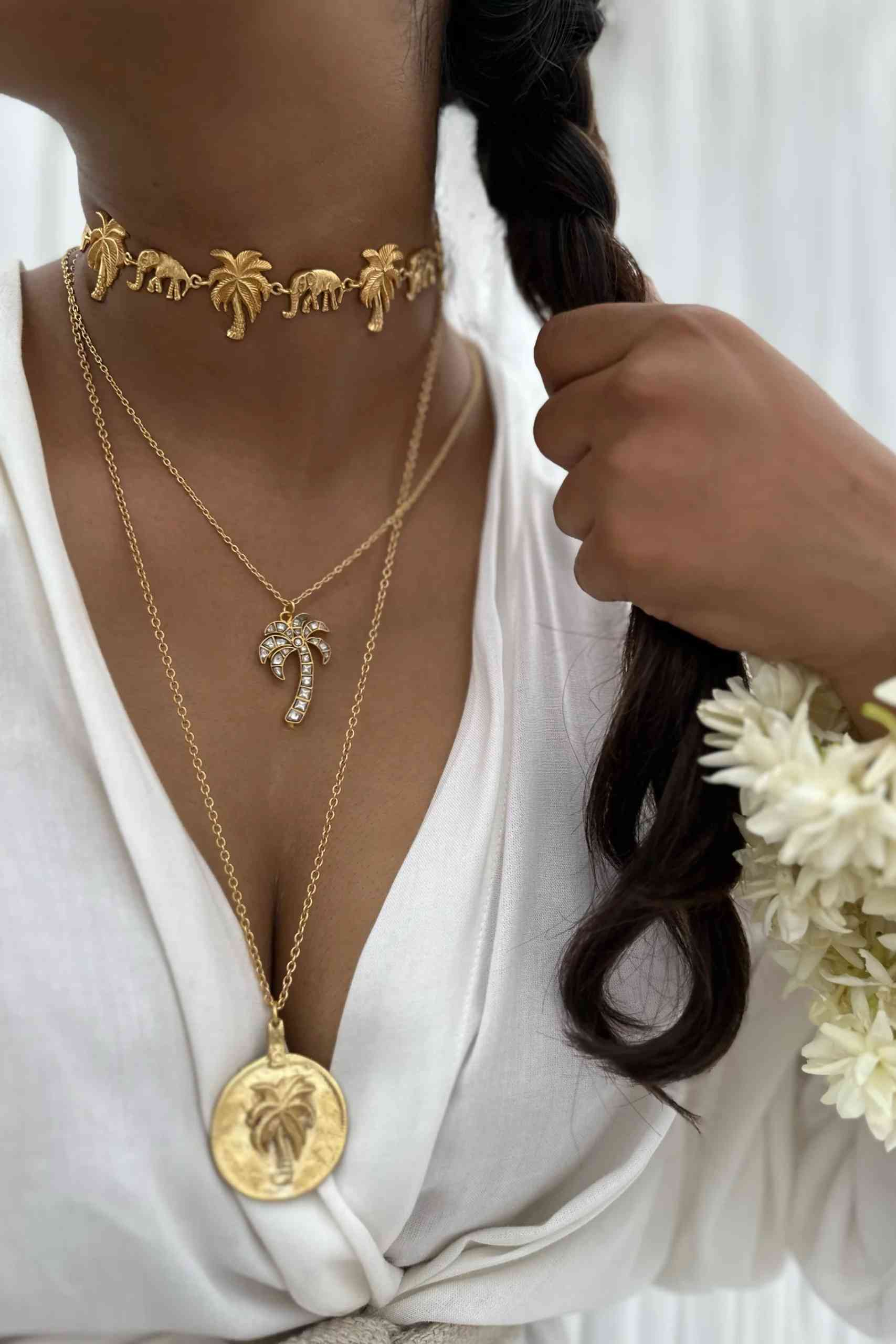 The Palms eve necklace is handcrafted in brass and dipped in gold. Made using the ancient jadau technique in Jaipur.