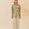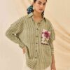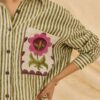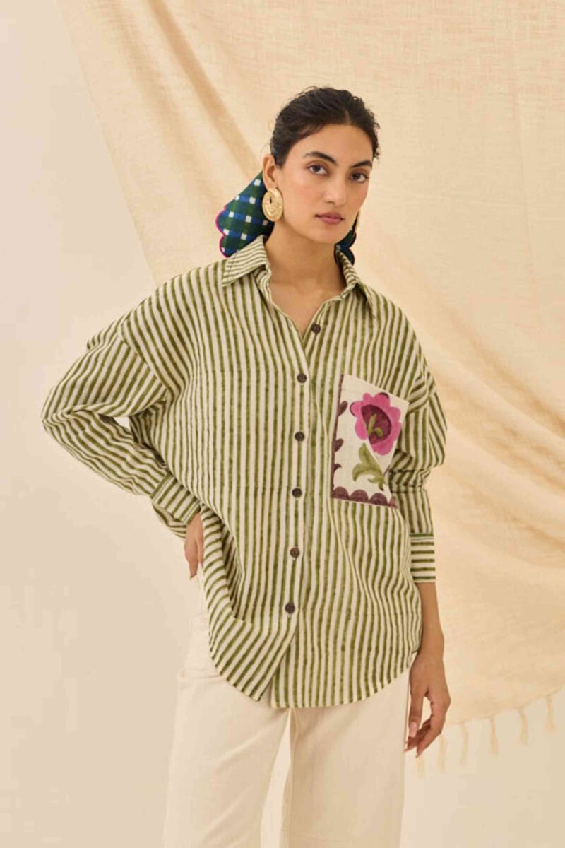A relaxed, oversized button-down shirt in the olive green stripe hand-block print. It features full sleeves, a classic collar, and is distinctively highlighted by a chest pocket overlaid with a large, bright pink floral, perfect for casual, effortless layering.