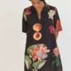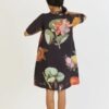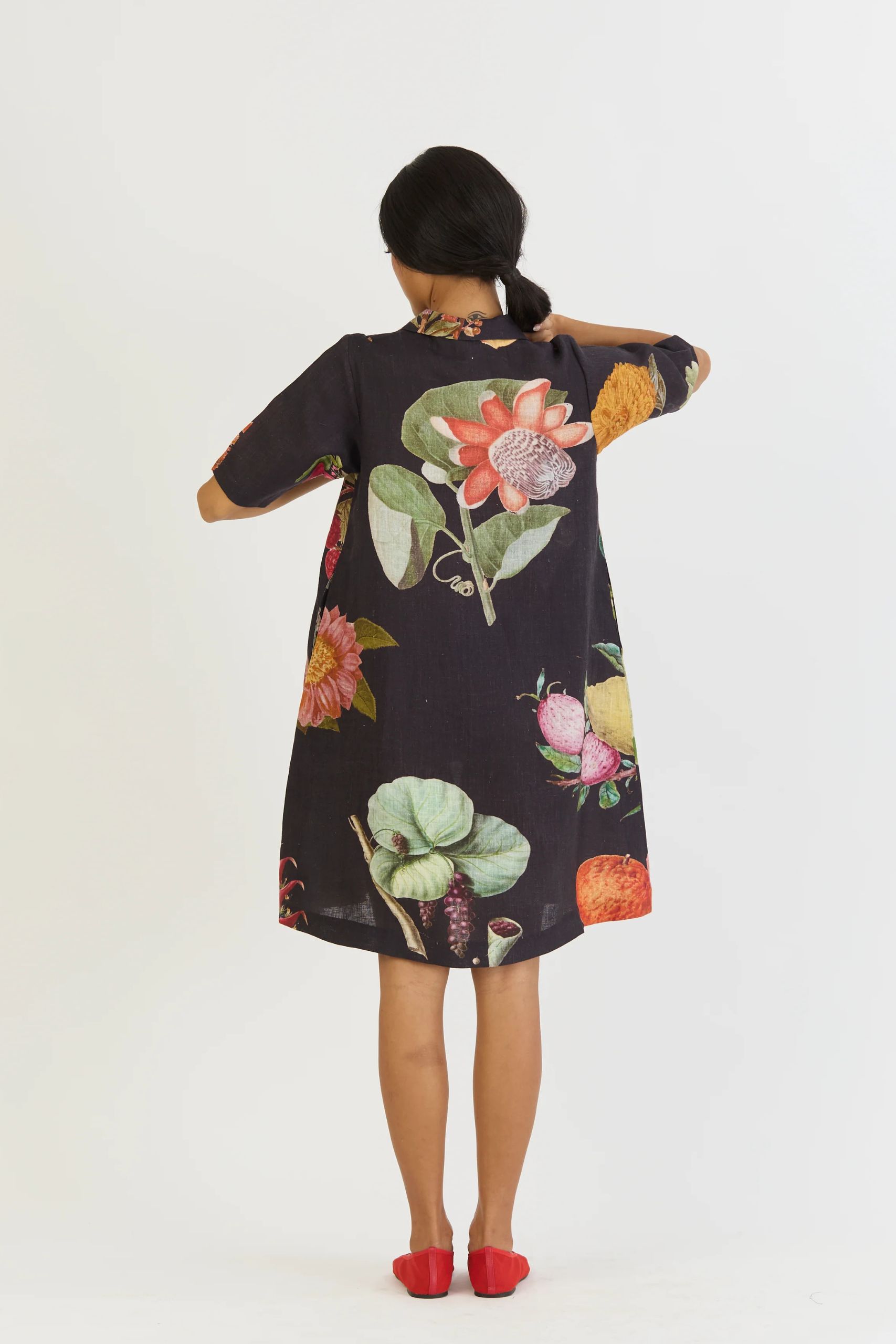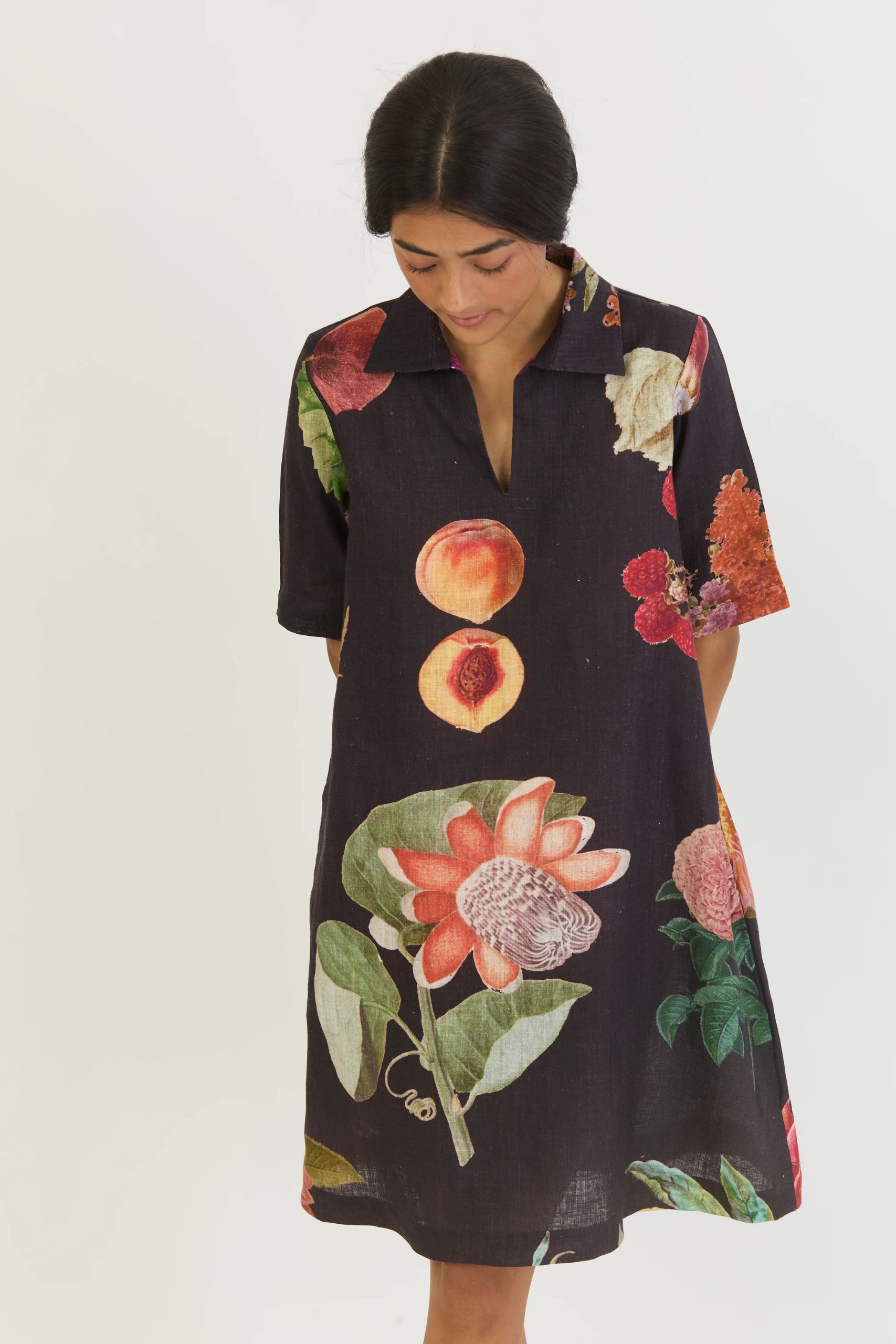 The enchanting Plum print, a breathtaking collection inspired by an old botanical tapestry. This exquisite design showcases watercolor florals, fruits, and leaves playfully dancing against a serene black background, evoking a touch of vintage charm.