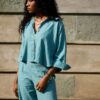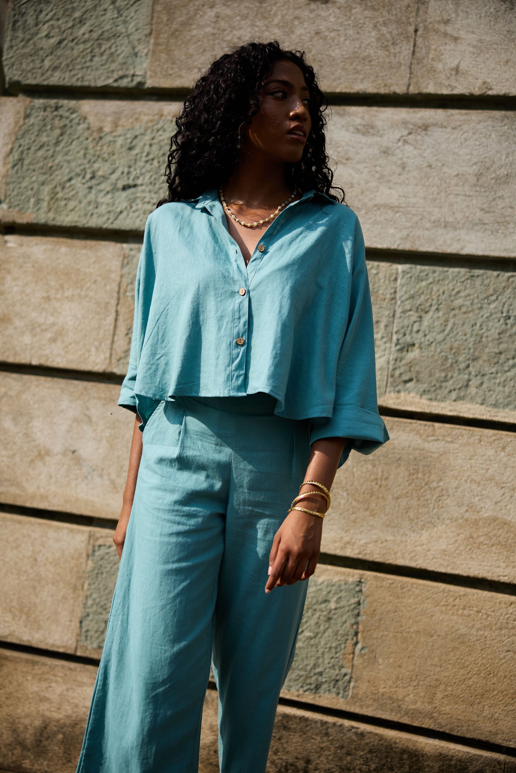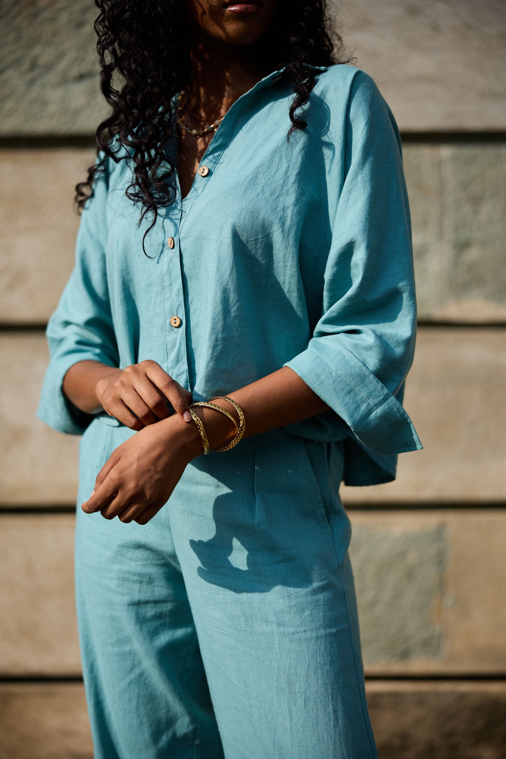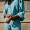 The shortest version of our linen shirts, definitely  modern with a hint of frivolity, subtly reveals the navel, and for the more classy, can be worn with shorts or high-waist pants. A lightweight shirt for your warm summer days, 3/4 sleeves, natural coconut buttons.