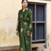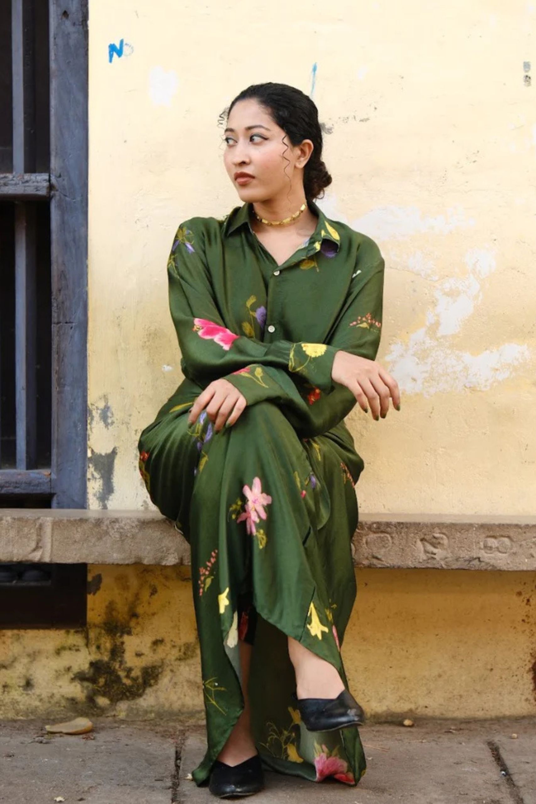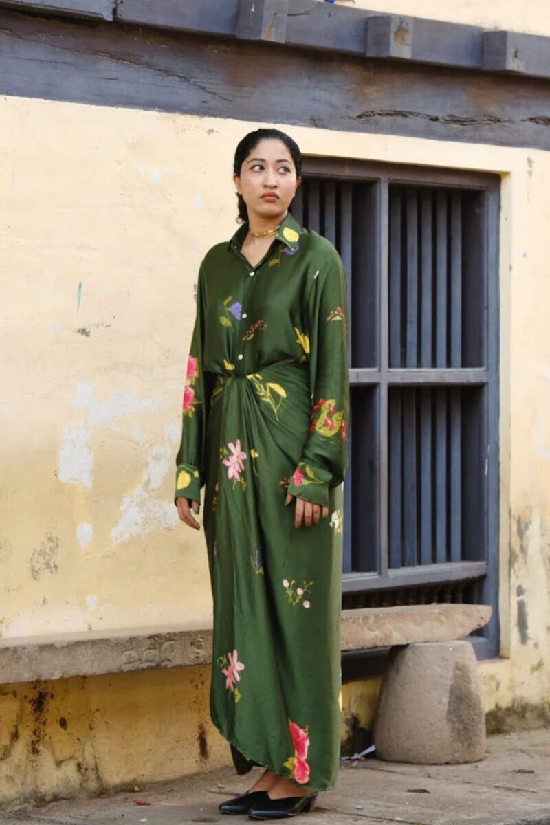 Features the hand-painted Pookkuda print — delicate floral doodles scattered in soft, earthy tones across a flowing drape skirt.
