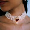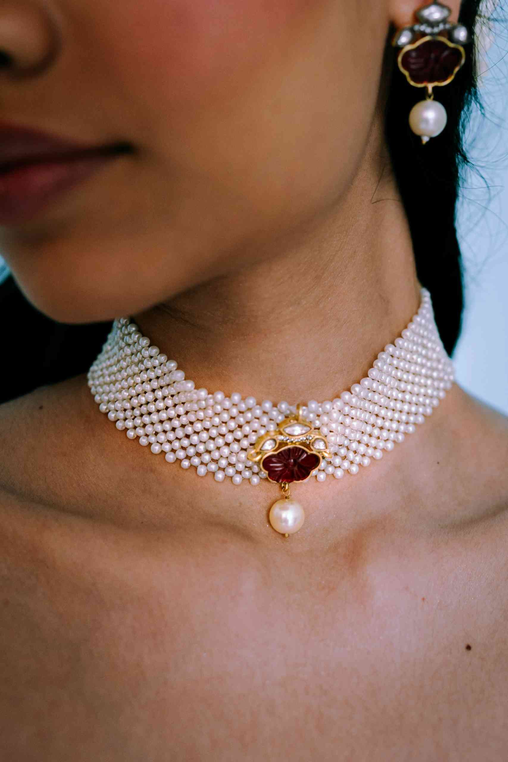 A cascade of hand-strung pearls forms this elegant choker, centered with hand-carved crimson bloom, framed in polki and crowned by a single pearl drop. Lightweight yet statement-making, it’s the perfect piece to transition effortlessly from a daytime saree to an elegant evening look.