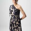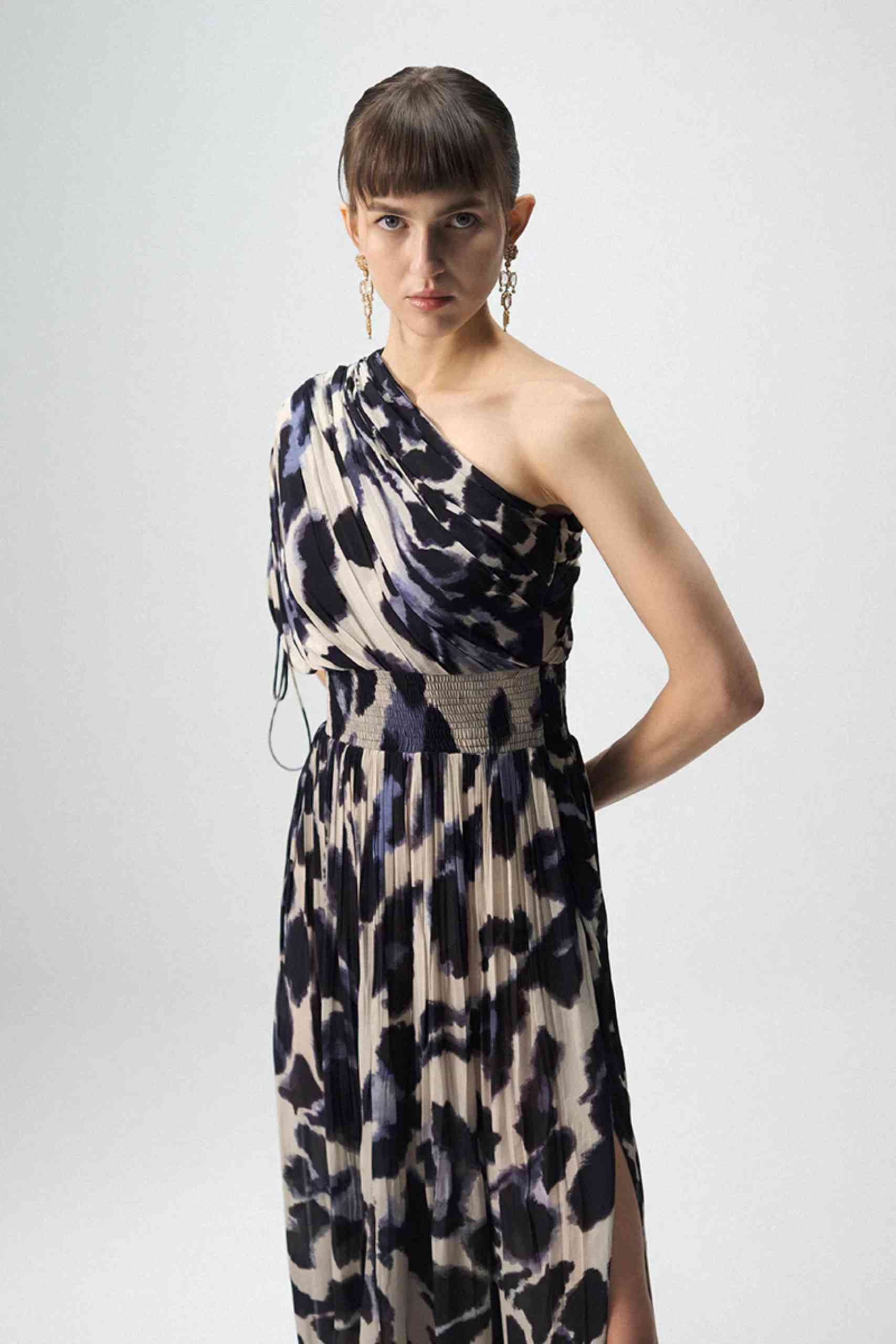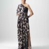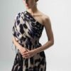 This elegant one-shoulder dress is crafted in luxurious crepe, offering a fluid drape and refined silhouette. The design features an asymmetric neckline with a softly gathered shoulder detail, enhanced with delicate drawstrings for a touch of adjustability and drama.