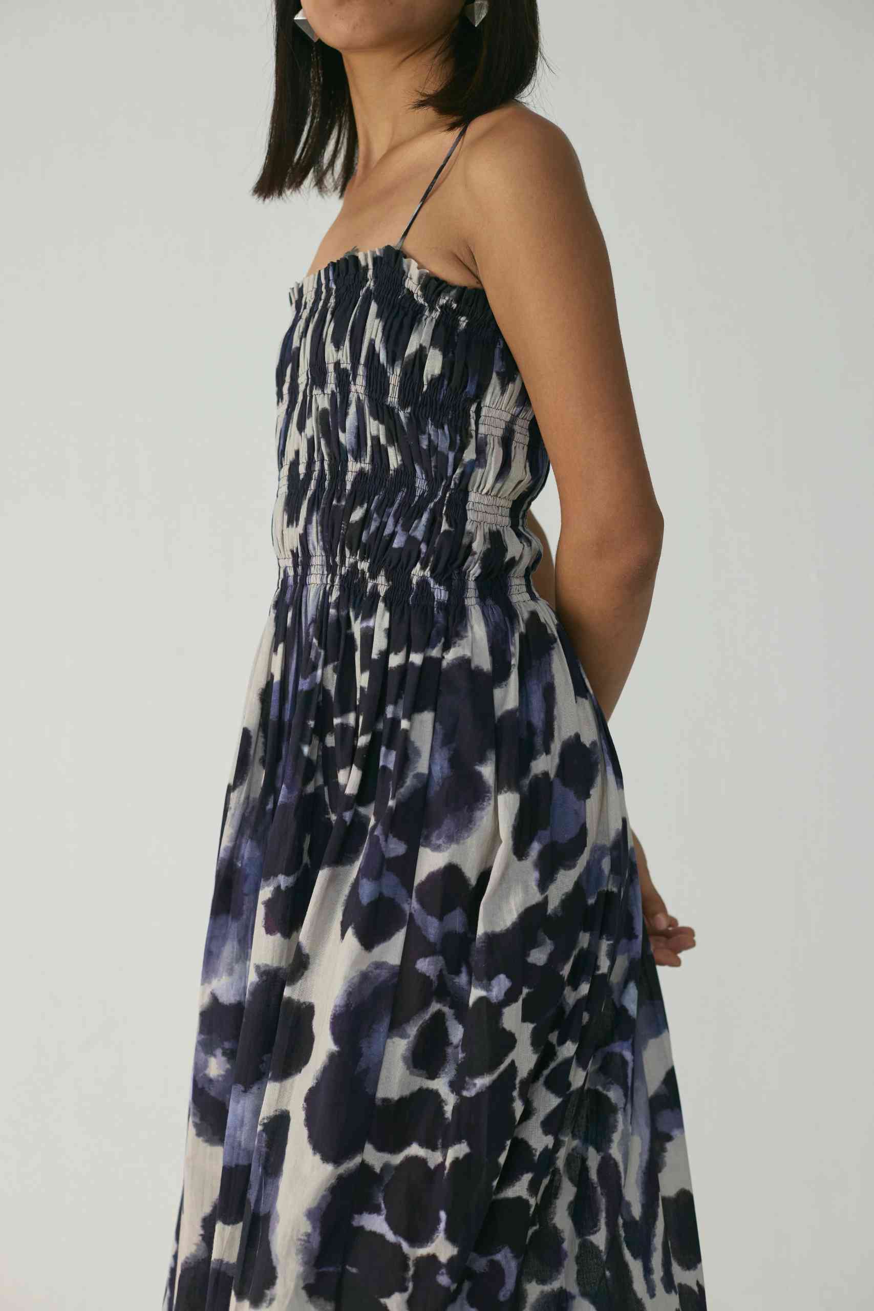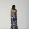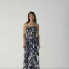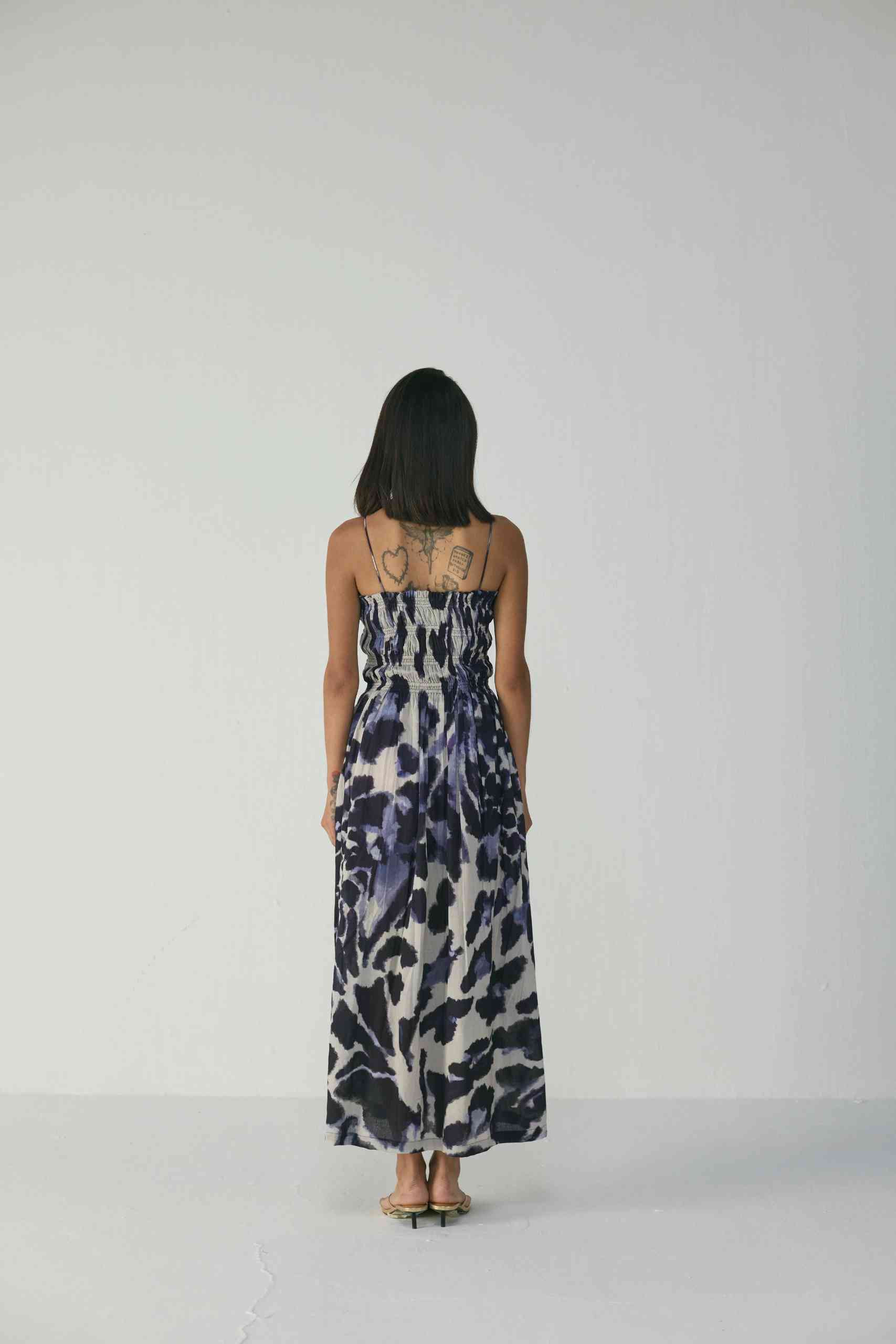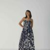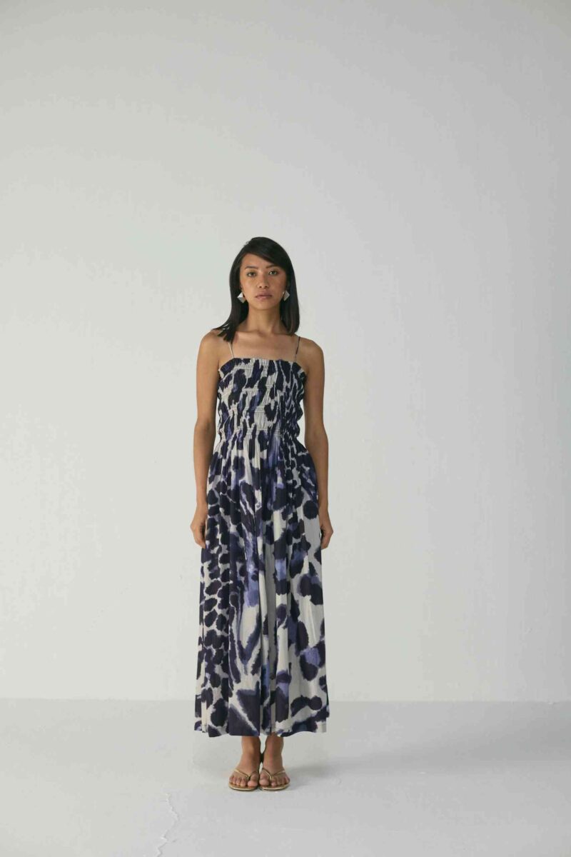 The upper body is fully lined to ensure a smooth and structured finish, while the skirt flows gracefully to ankle length, making it ideal for both day and evening occasions. The striking abstract indigo and ivory print adds a touch of modern artistry to this timeless silhouette.