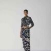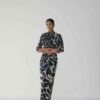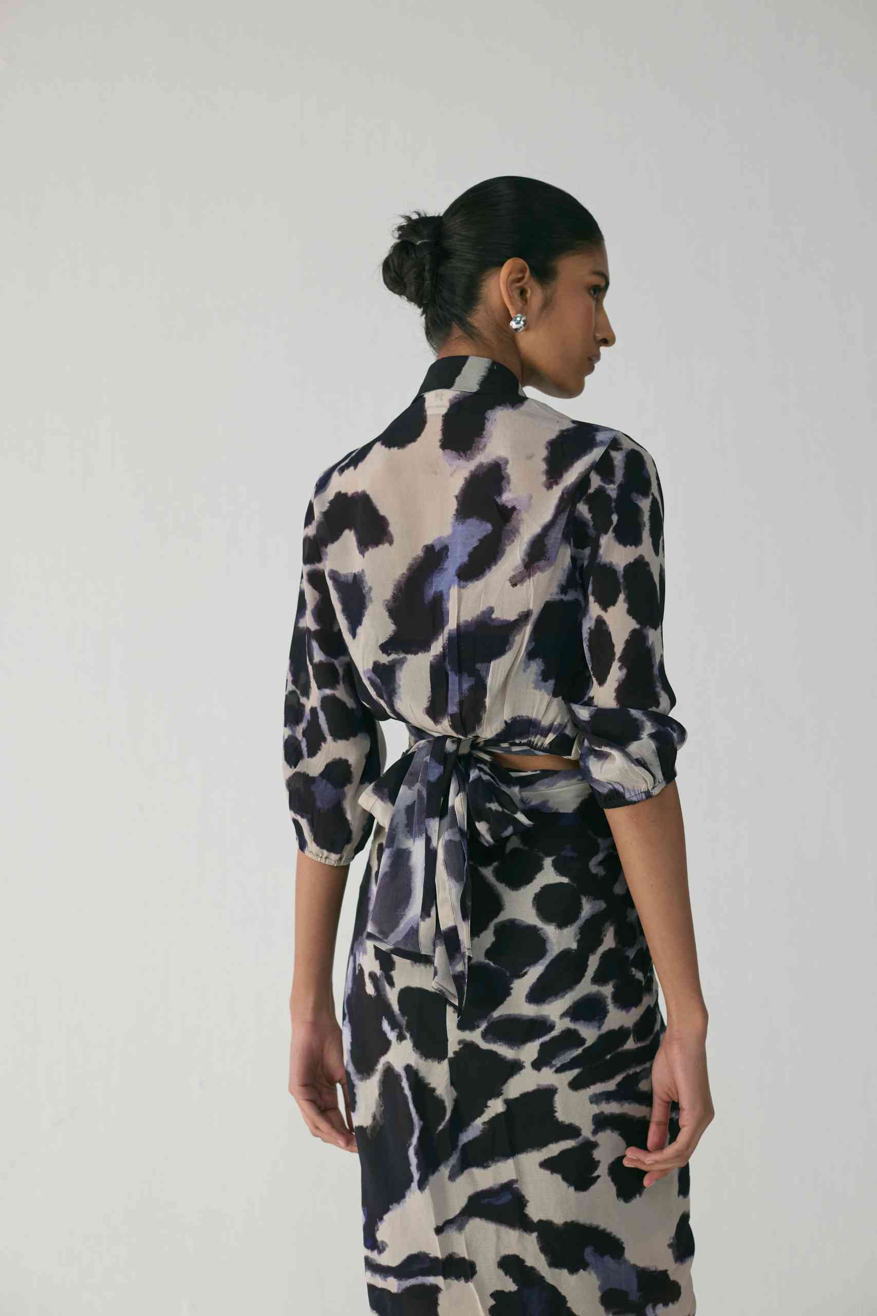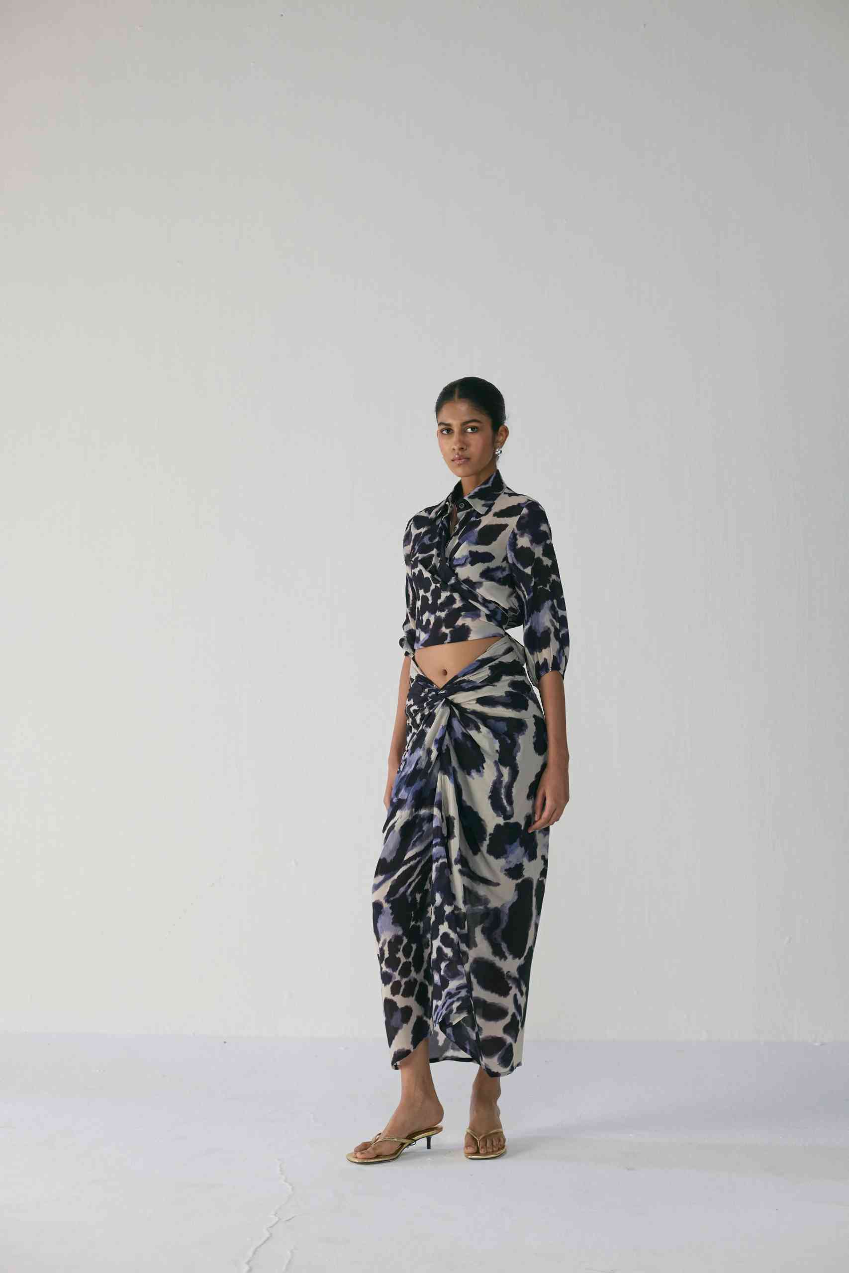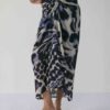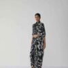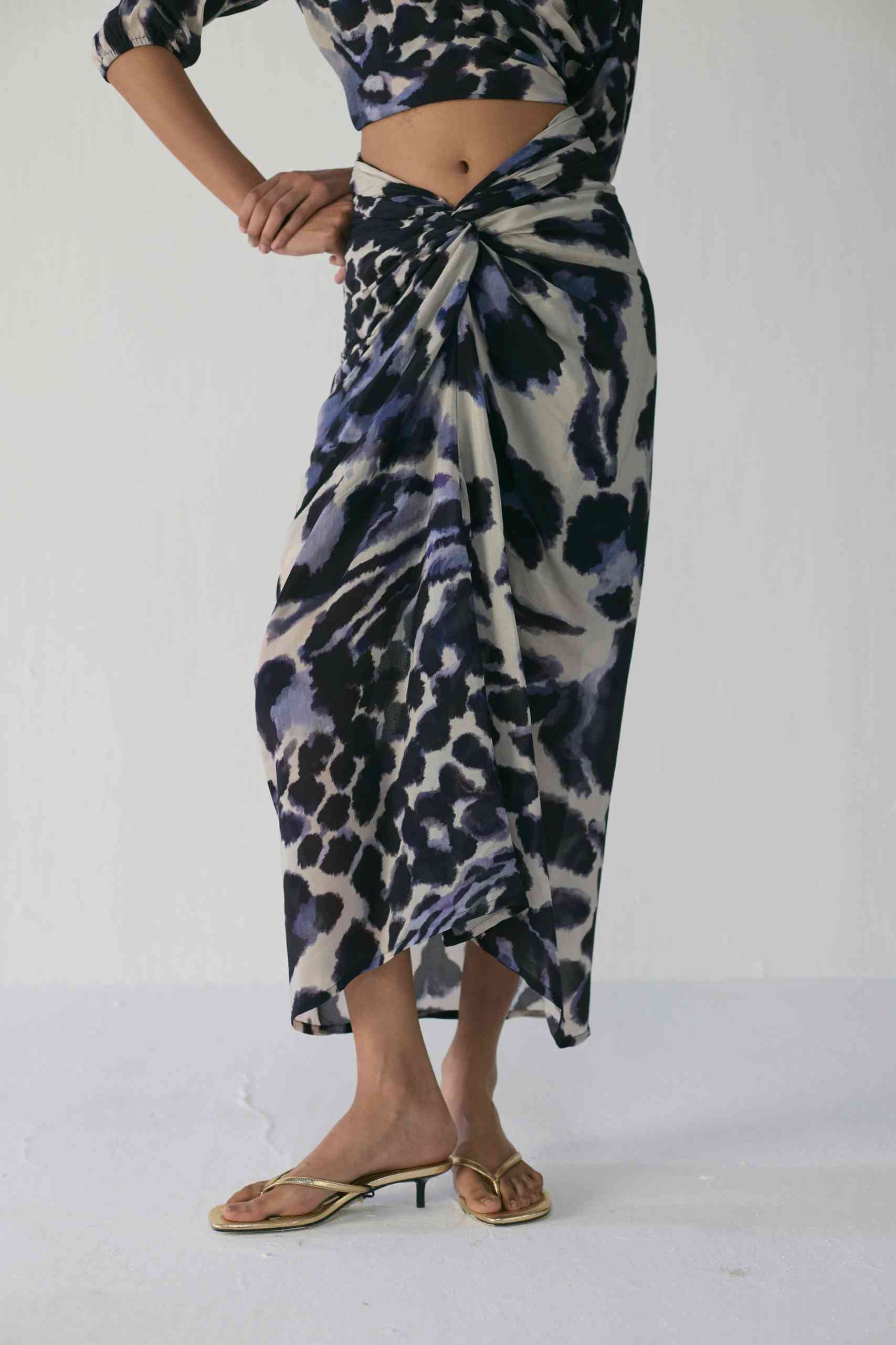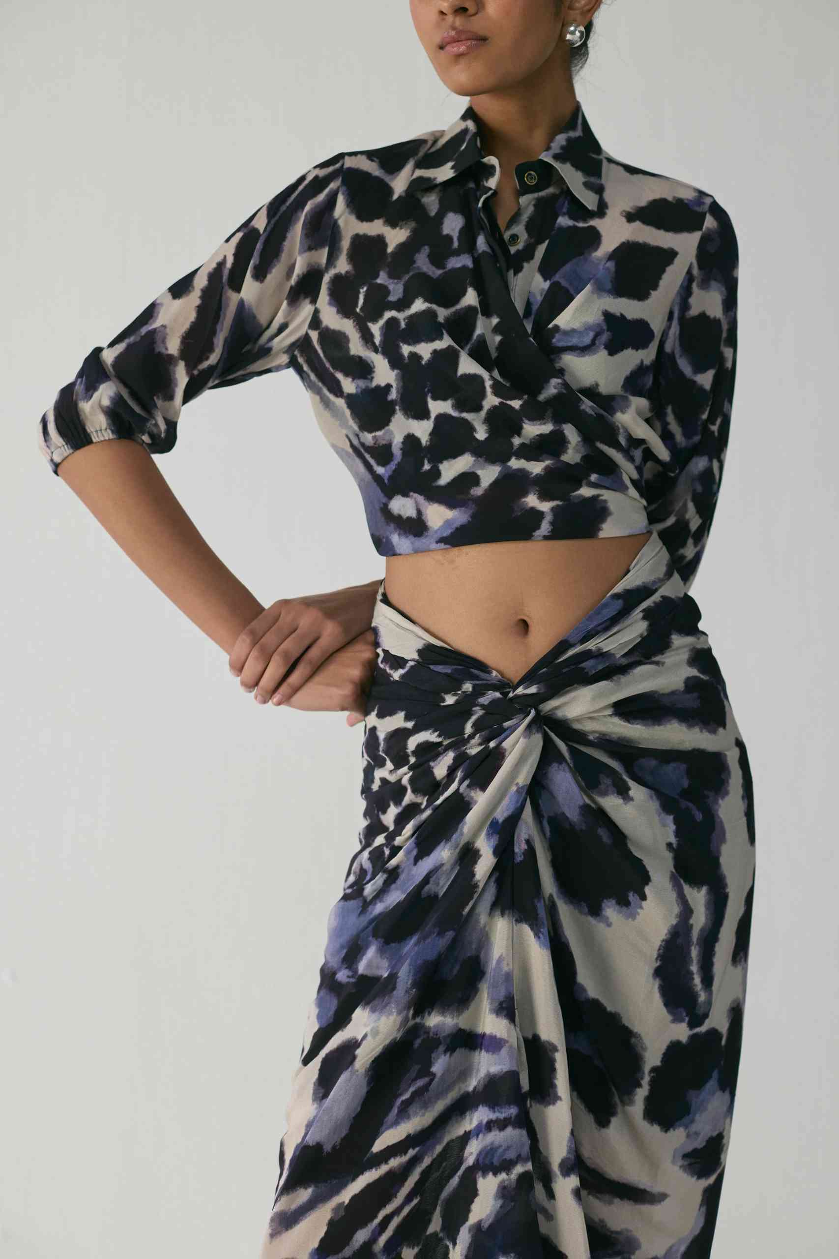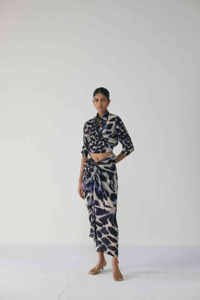 Effortlessly elegant and contemporary, this set is crafted in luxurious crepe, designed to flatter with its fluid drape and modern silhouette. The set features a wrap-style shirt and a draped skirt, both showcasing an abstract painterly print in deep navy and ivory tones — a striking balance of artistry and sophistication.