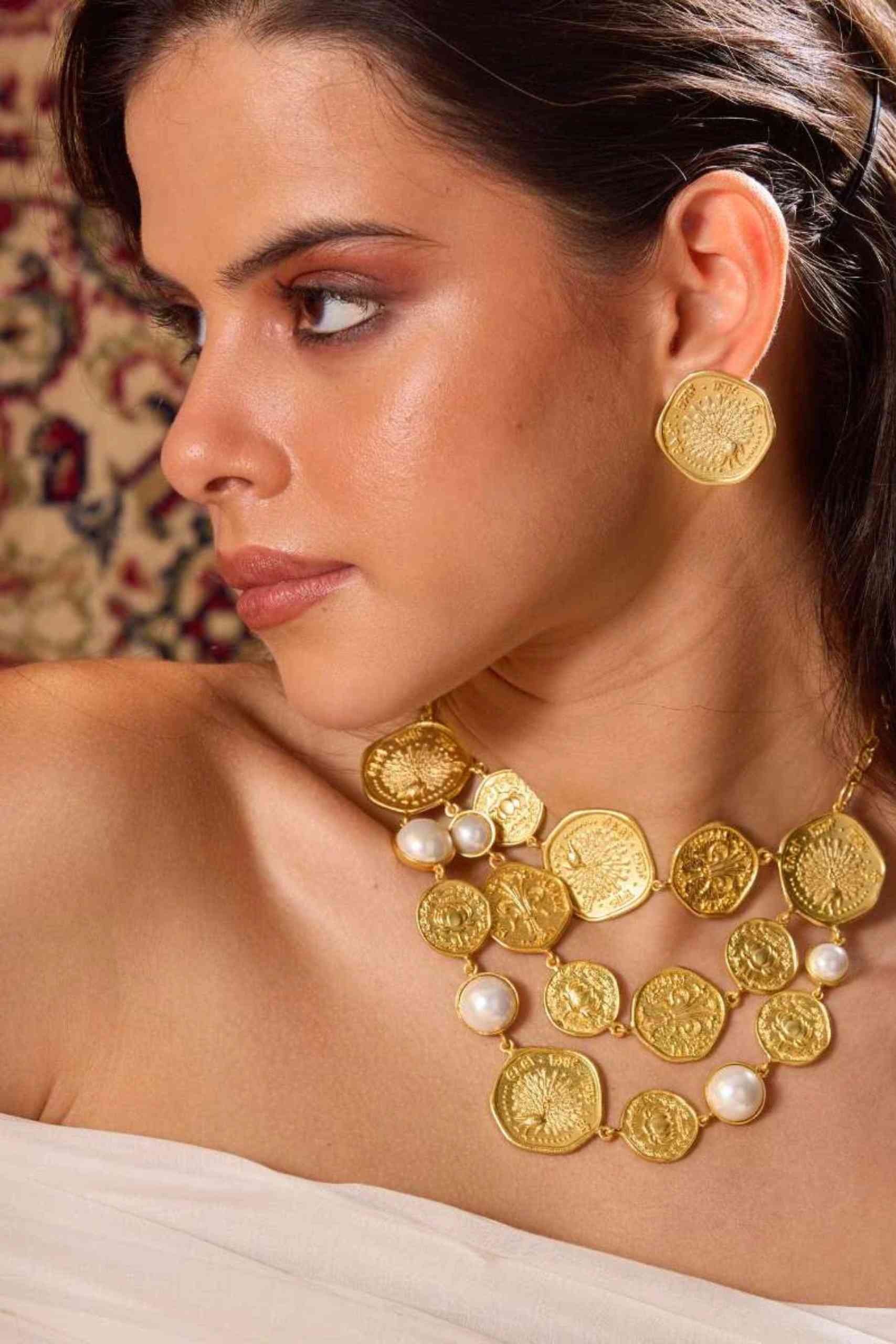 The Shakti Stardust Necklace from the Shakti Coin Collection beautifully blends tradition with contemporary design. Featuring symbols like the Lotus, representing purity and growth, and the Peacock, embodying confidence and strength, this piece is accented with timeless pearls. Celebrate your inner power and elegance—Shakti is power, Shakti is you.