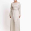 An elegant modest maxi dress crafted in softly shimmering fabric, featuring delicate side-lace detailing for a refined feminine touch. Designed with a flowing full-length silhouette and graceful coverage, it’s perfect for occasions or elevated everyday wear.