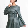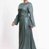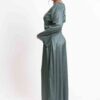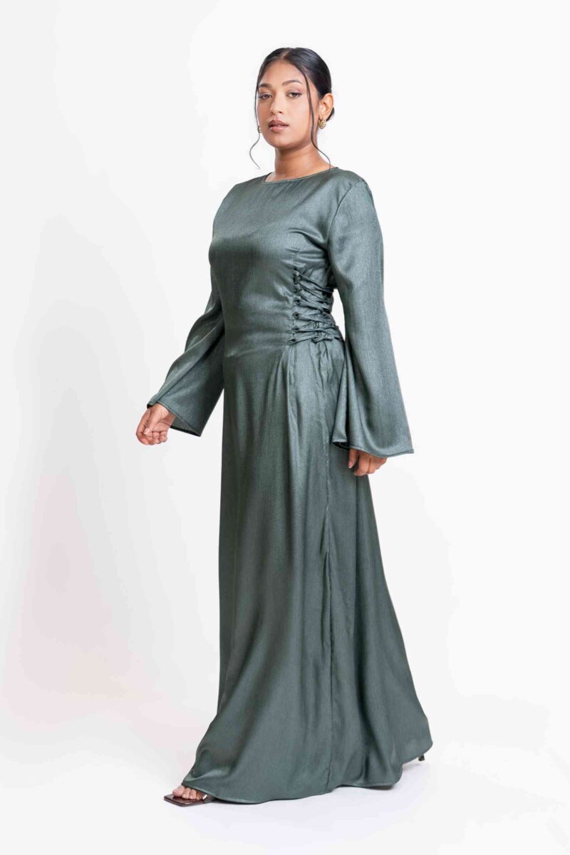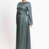 An elegant modest maxi dress crafted in softly shimmering fabric, featuring delicate side-lace detailing for a refined feminine touch. Designed with a flowing full-length silhouette and graceful coverage, it’s perfect for occasions or elevated everyday wear.
