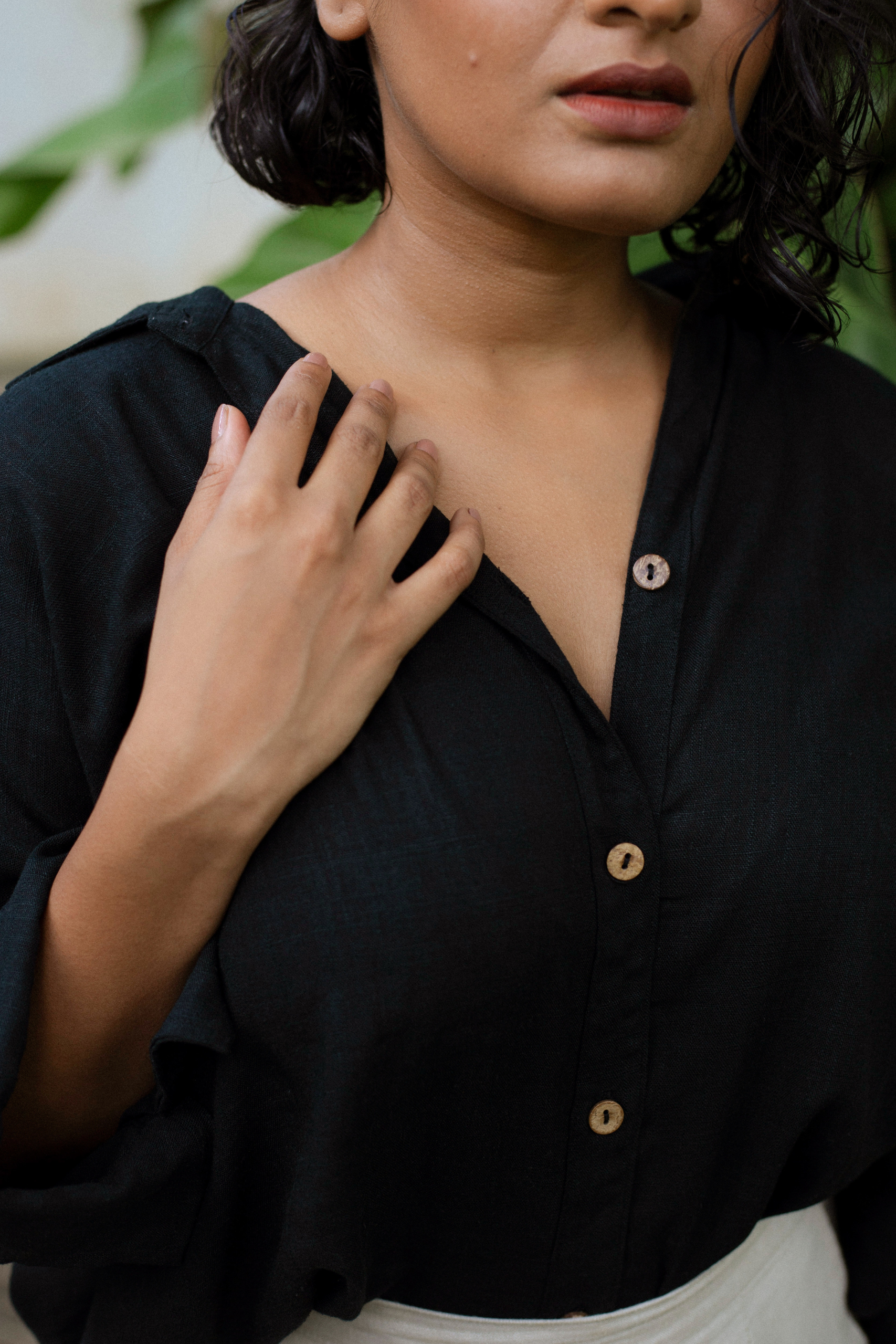 The Suhasna shirt is surely the most classic but also the most elegant, for work or for going out, tied above the waist, day or night, it will follow you wherever you go. 3/4 sleeves, coconut buttons, lightweight natural linen available in 4 colors.