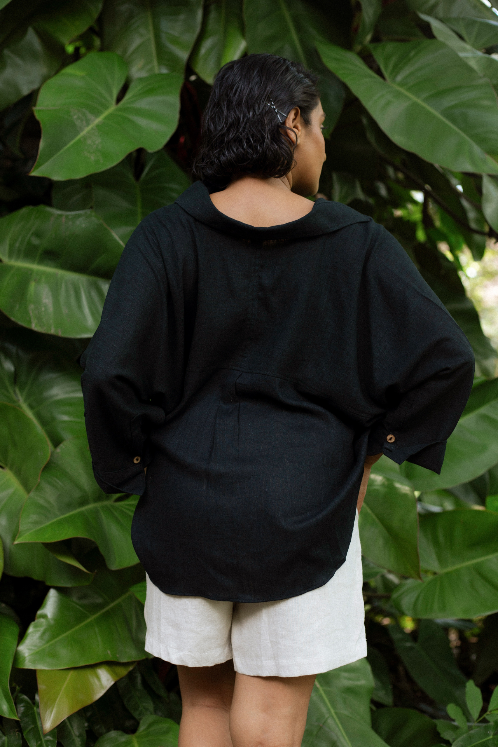 • Linen shirt falls to the hips