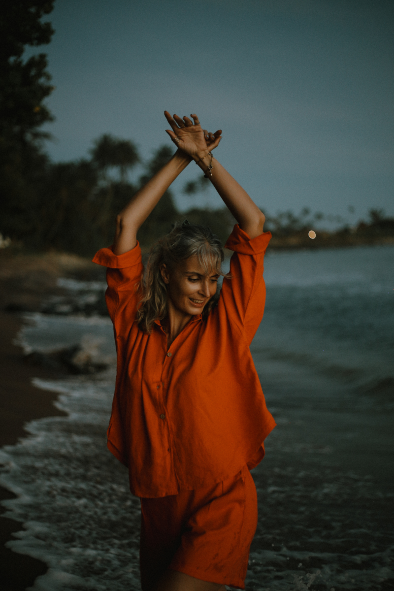 The Suhasna shirt is surely the most classic but also the most elegant, for work or for going out, tied above the waist, day or night, it will follow you wherever you go. 3/4 sleeves, coconut buttons, lightweight natural linen available in 4 colors.