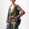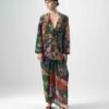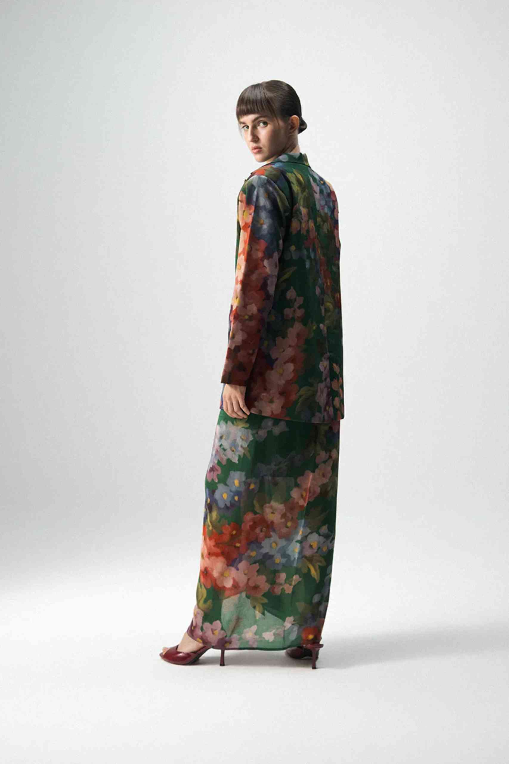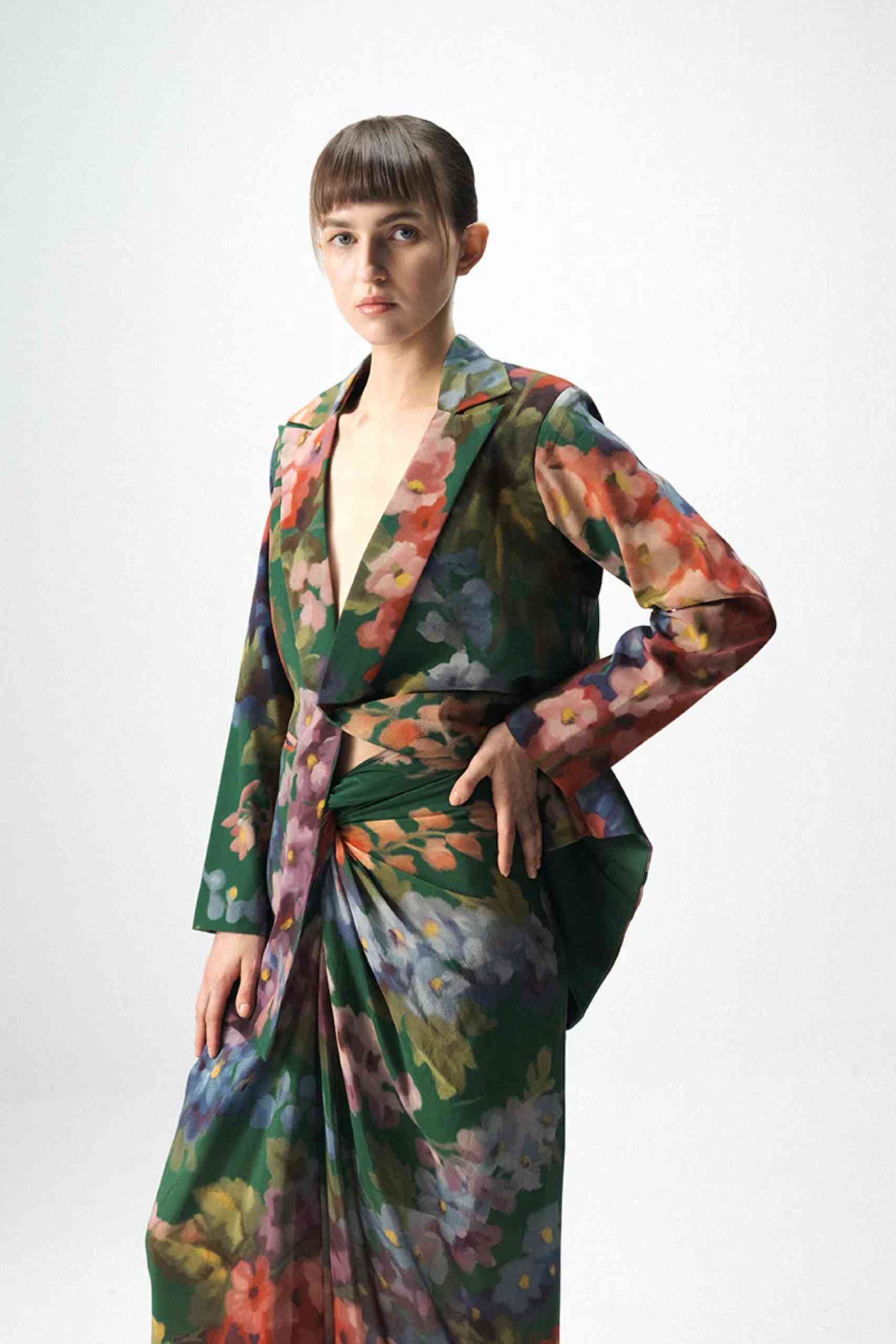 The set is crafted in luxurious crepe, featuring a vivid, painterly floral print that evokes the feel of an abstract garden. The ensemble includes a structured blazer paired with a knotted skirt, creating a striking balance between tailored sophistication and fluid femininity.