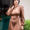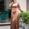An elegant modest maxi dress in a rich bronze tone, featuring a flattering tie-waist detail that enhances the silhouette while maintaining graceful coverage. Designed with a flowing full-length cut and soft drape, it’s perfect for both special occasions and polished everyday wear.