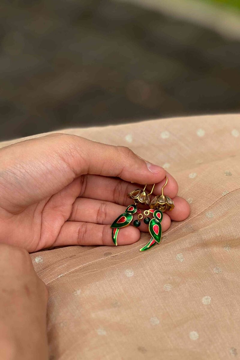 Inspired by the stunning colors and playful grace of the Indian parakeet, these earrings capture the essence of nature’s beauty and the exotic charm of these beloved birds.