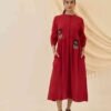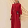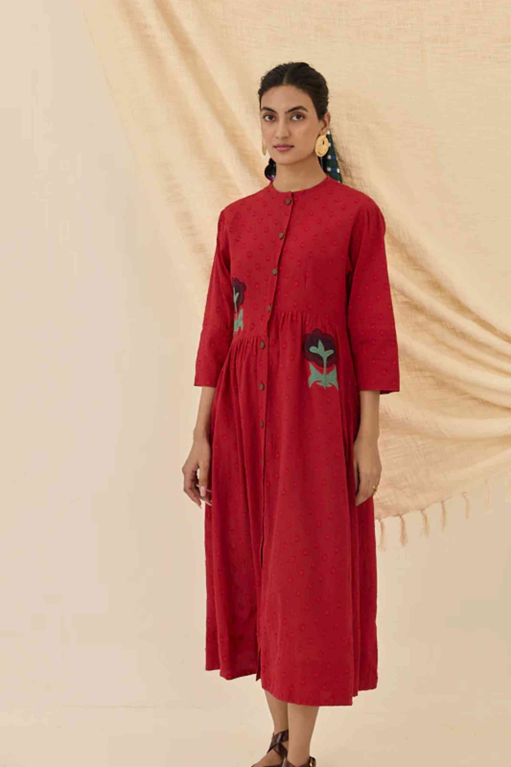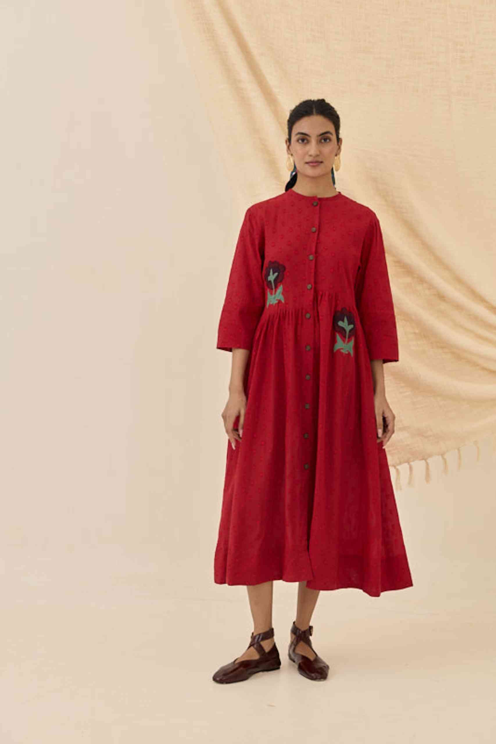 Meet the Unab Dress — an ode to easy elegance. Cut from soft cotton, this rich red midi features appliquéd floral motifs at the waist for a playful pop of detail. The relaxed fit, button-down front, and subtle gathers lend it that effortless flow Jodi is loved for. Style it buttoned up for a polished look or layer it open over your favourite separates — a true all-day companion with handcrafted charm.